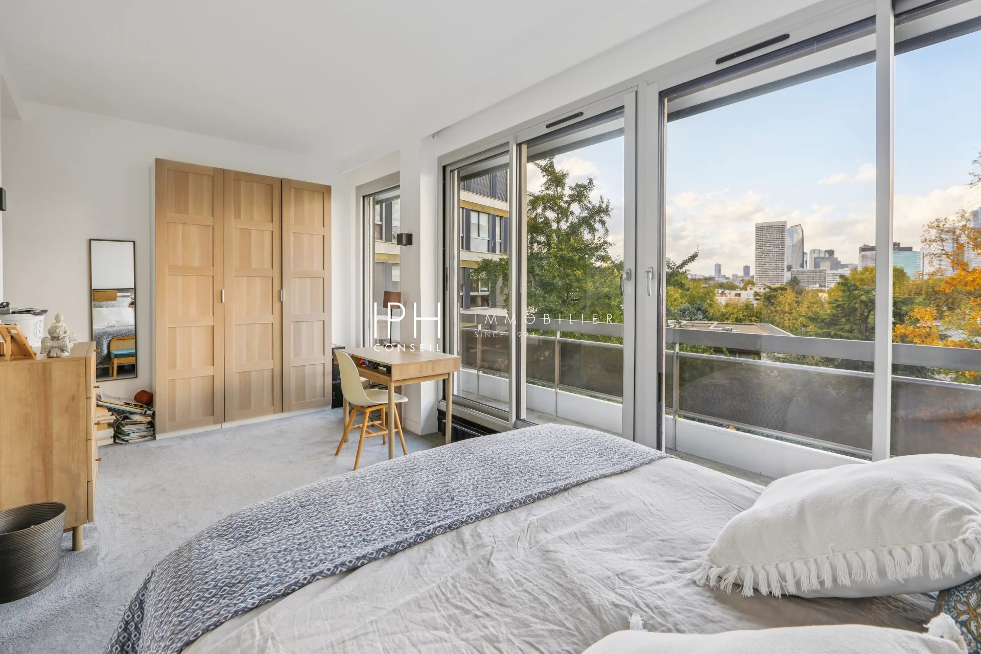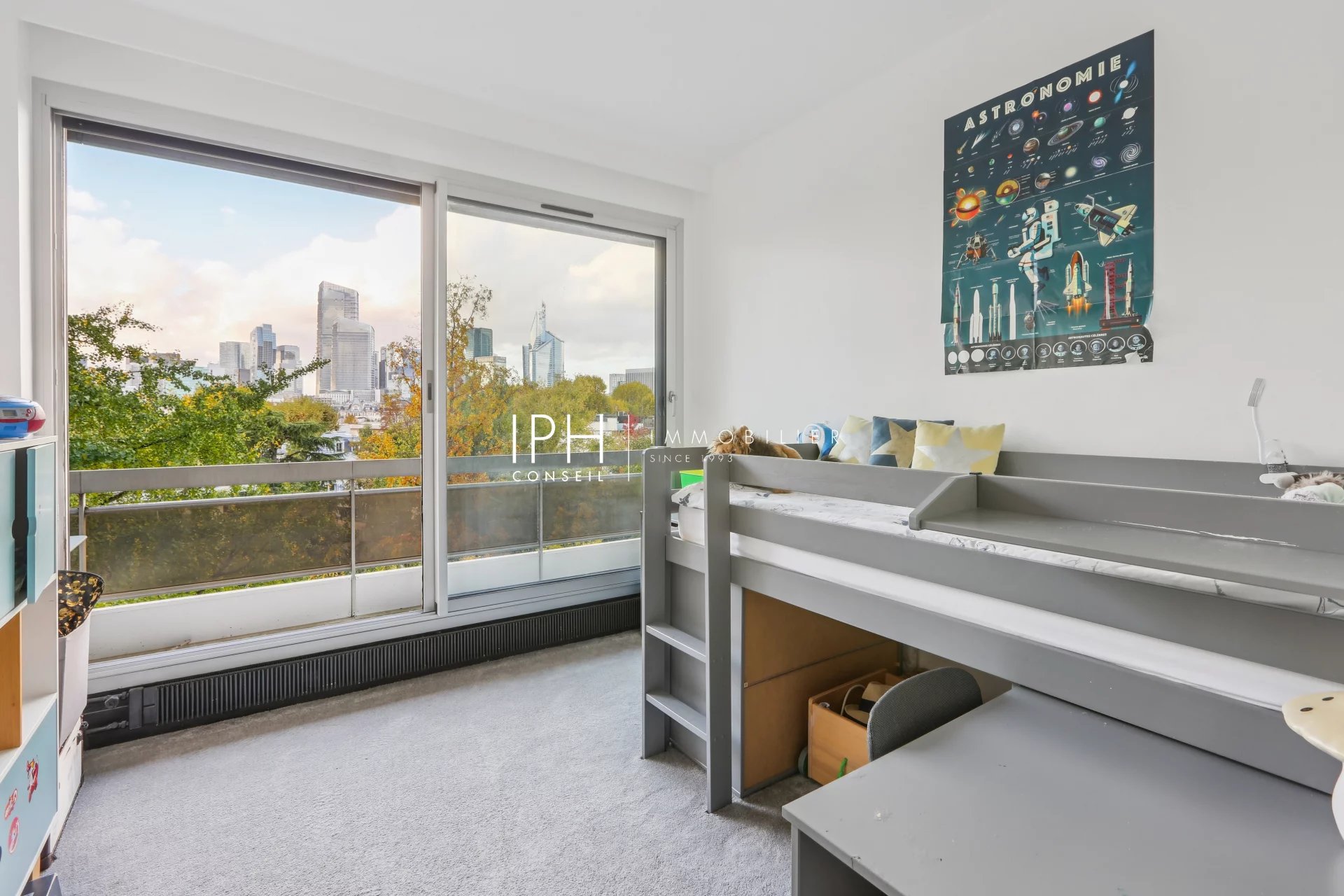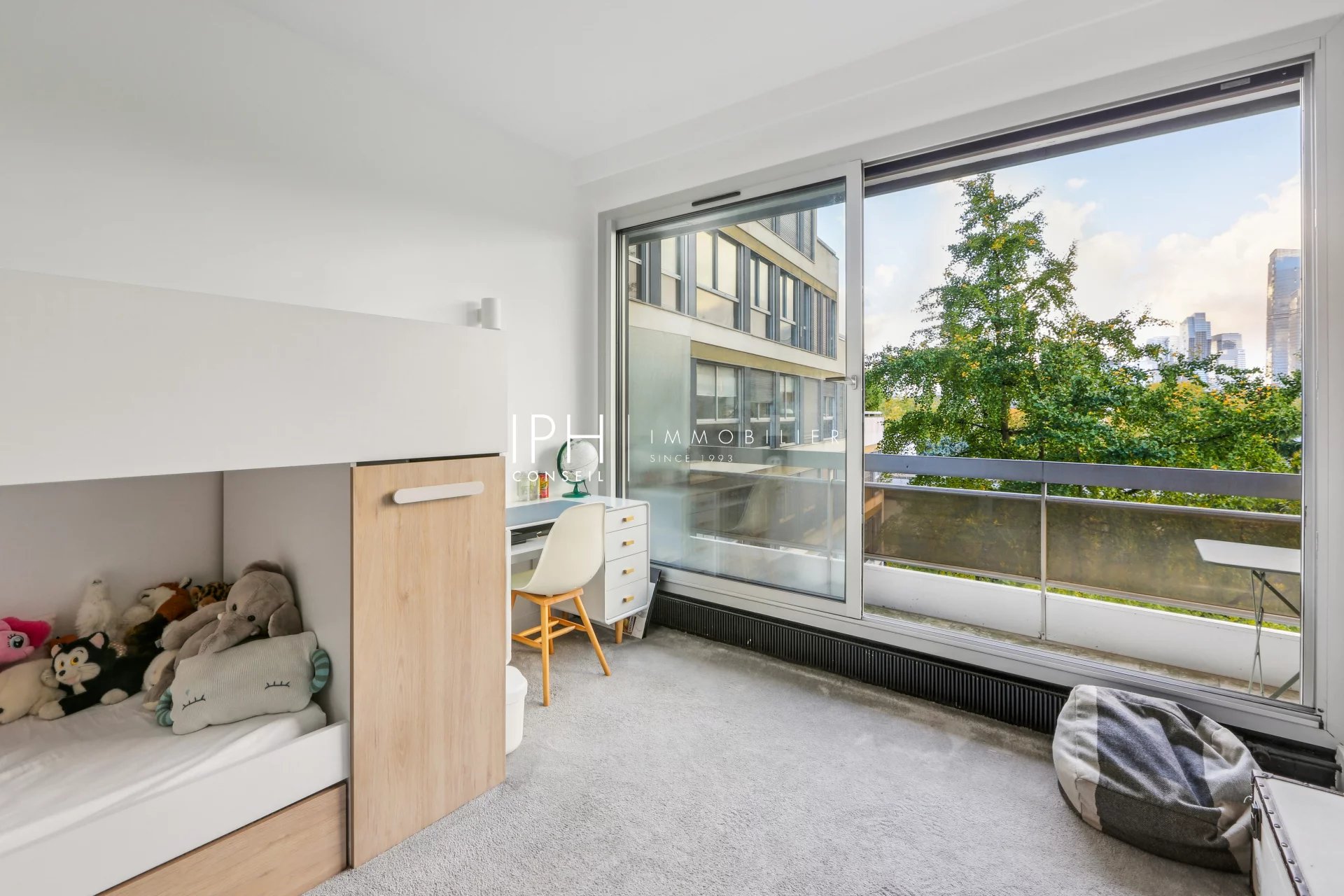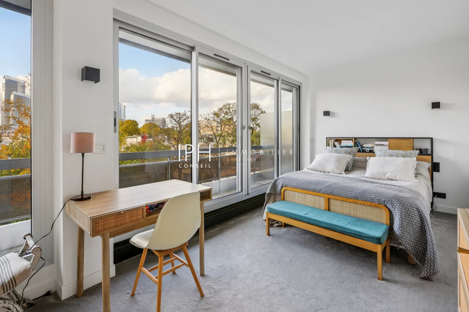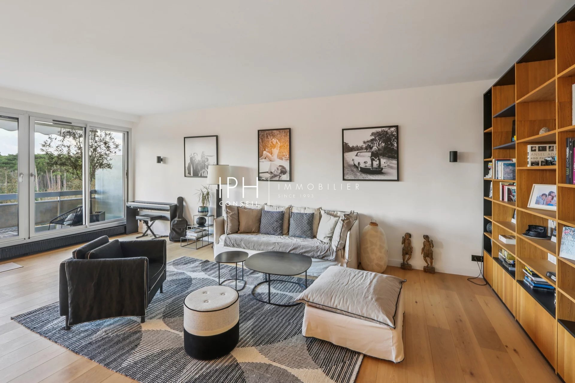 L’appartement se compose d’un vaste séjour Sud-Est baigné de lumière, prolongé par un balcon sans aucun vis-à-vis, offrant une vue imprenable sur le Bois de Boulogne.
