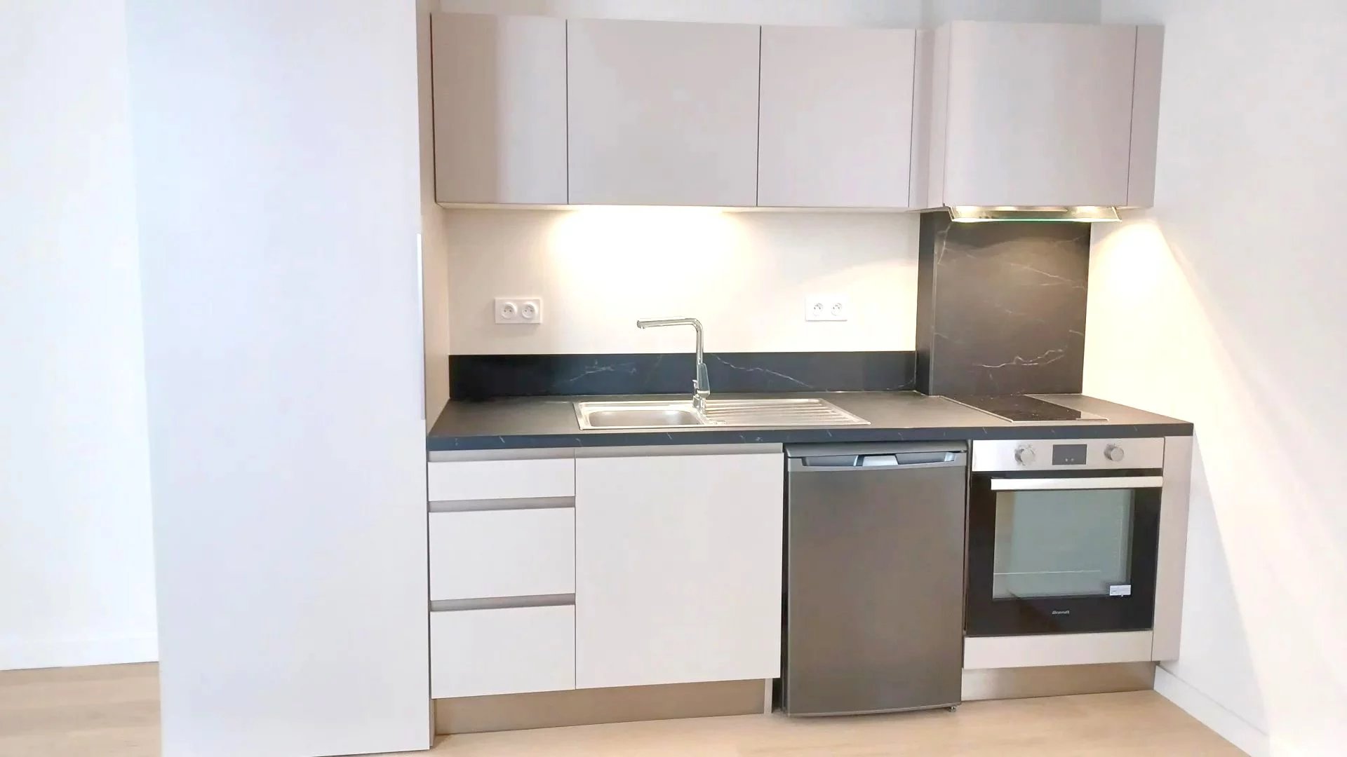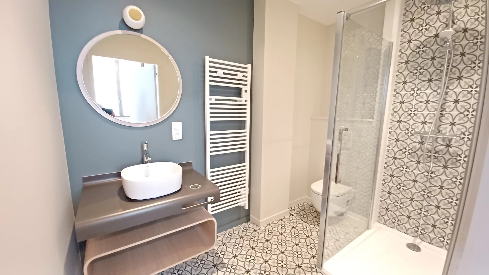 L’appartement dispose également d’une salle d’eau moderne avec toilettes, alliant praticité et esthétisme.