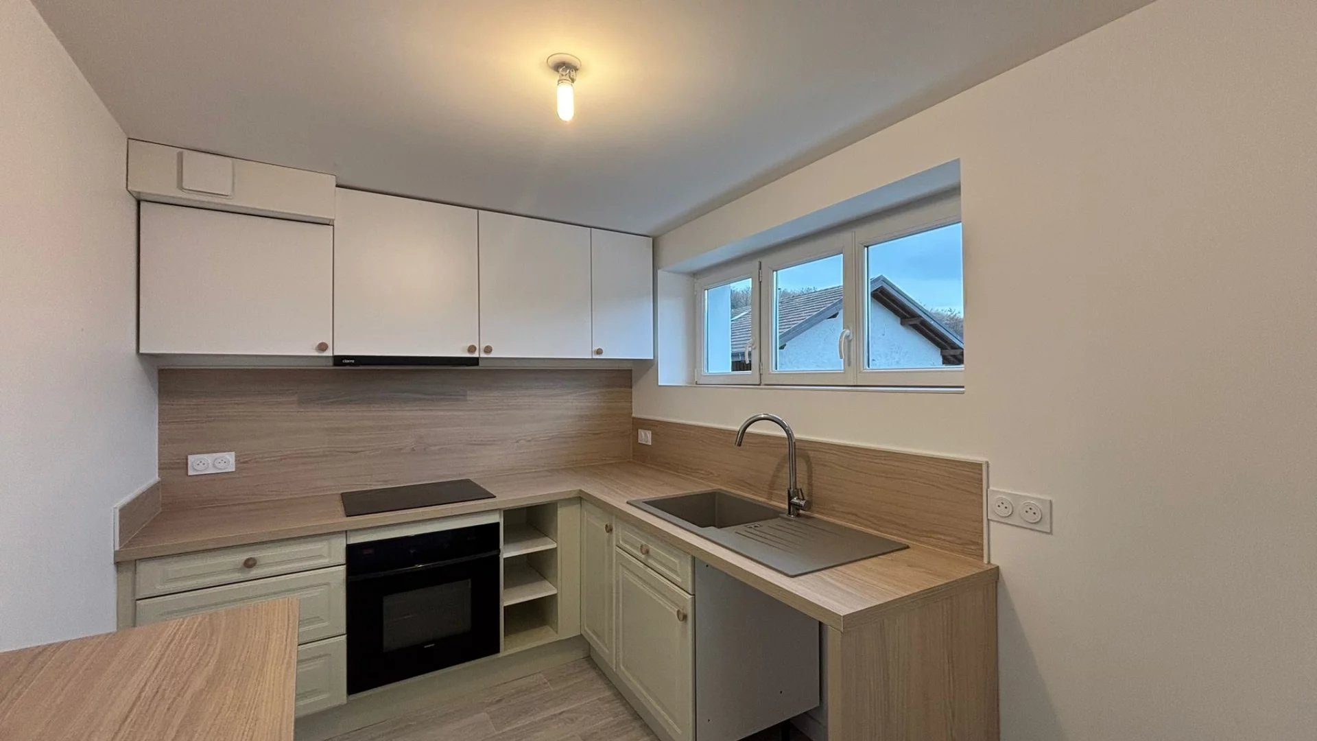 VILLE LA GRAND - dans un quartier calme en hauteur de Ville la grand, à louer un appartement de 3 pièces au premier étage dans une maison individuelle, avec cuisine équipée (four, plaque de cuisson et hotte), une cave et une place de parking. Disponible immédiatement (référence internet 142)