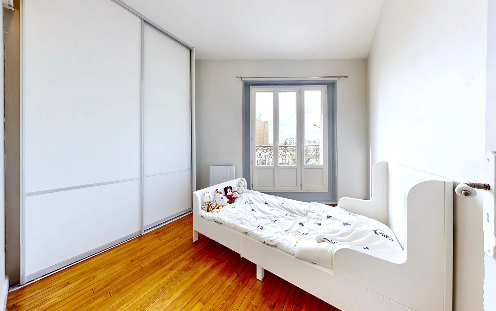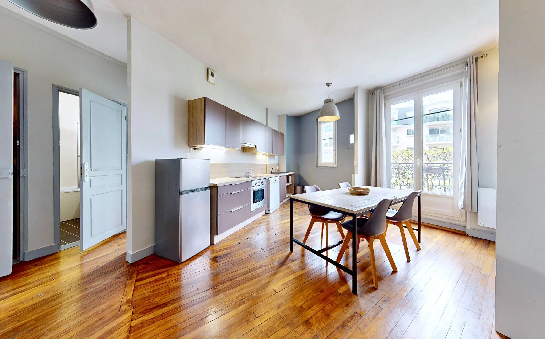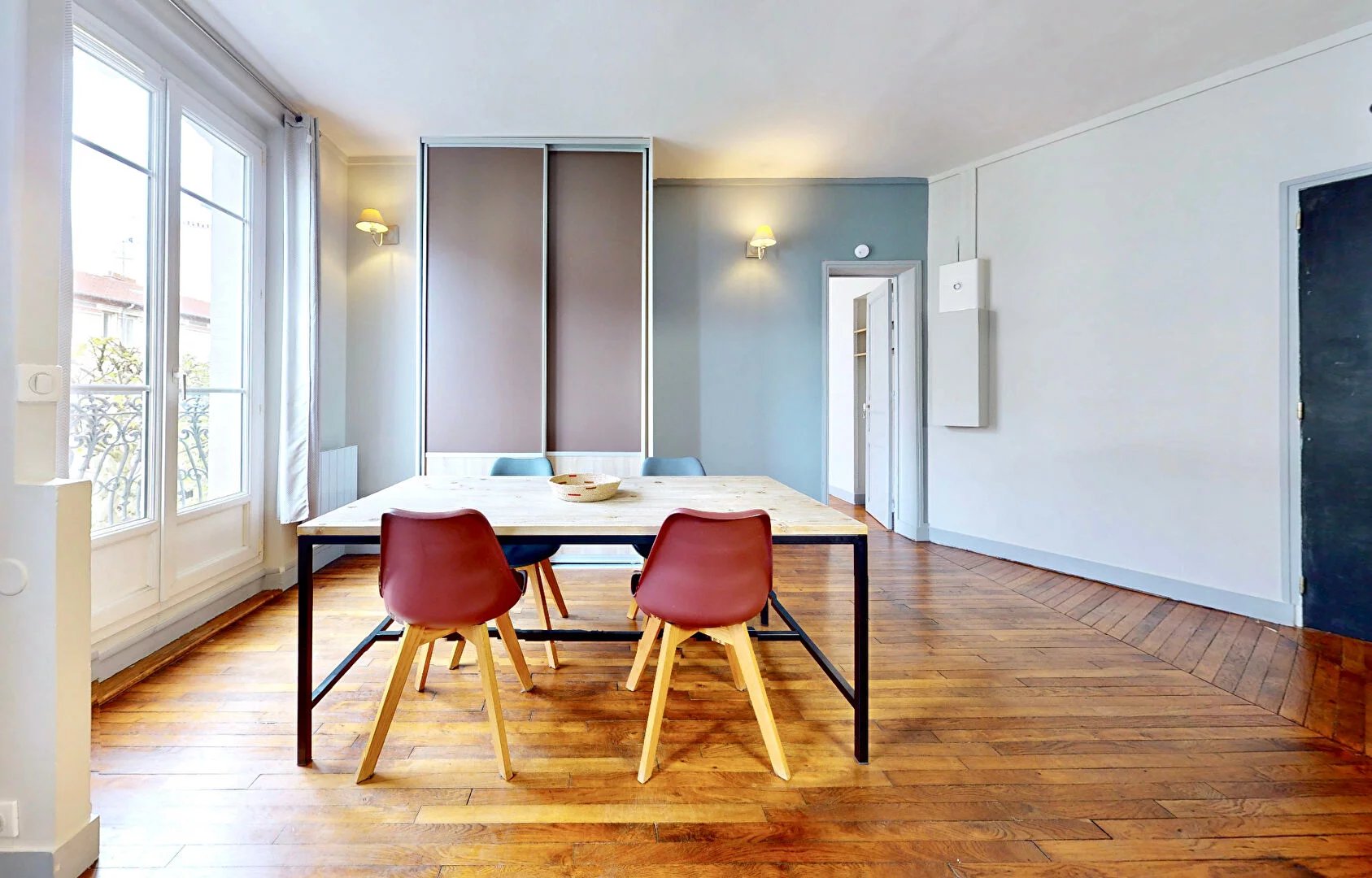 Emplacement central permettant de nombreux déplacements à pied : à 5 min des commerces de la rue Voltaire, à 9 min du marché.