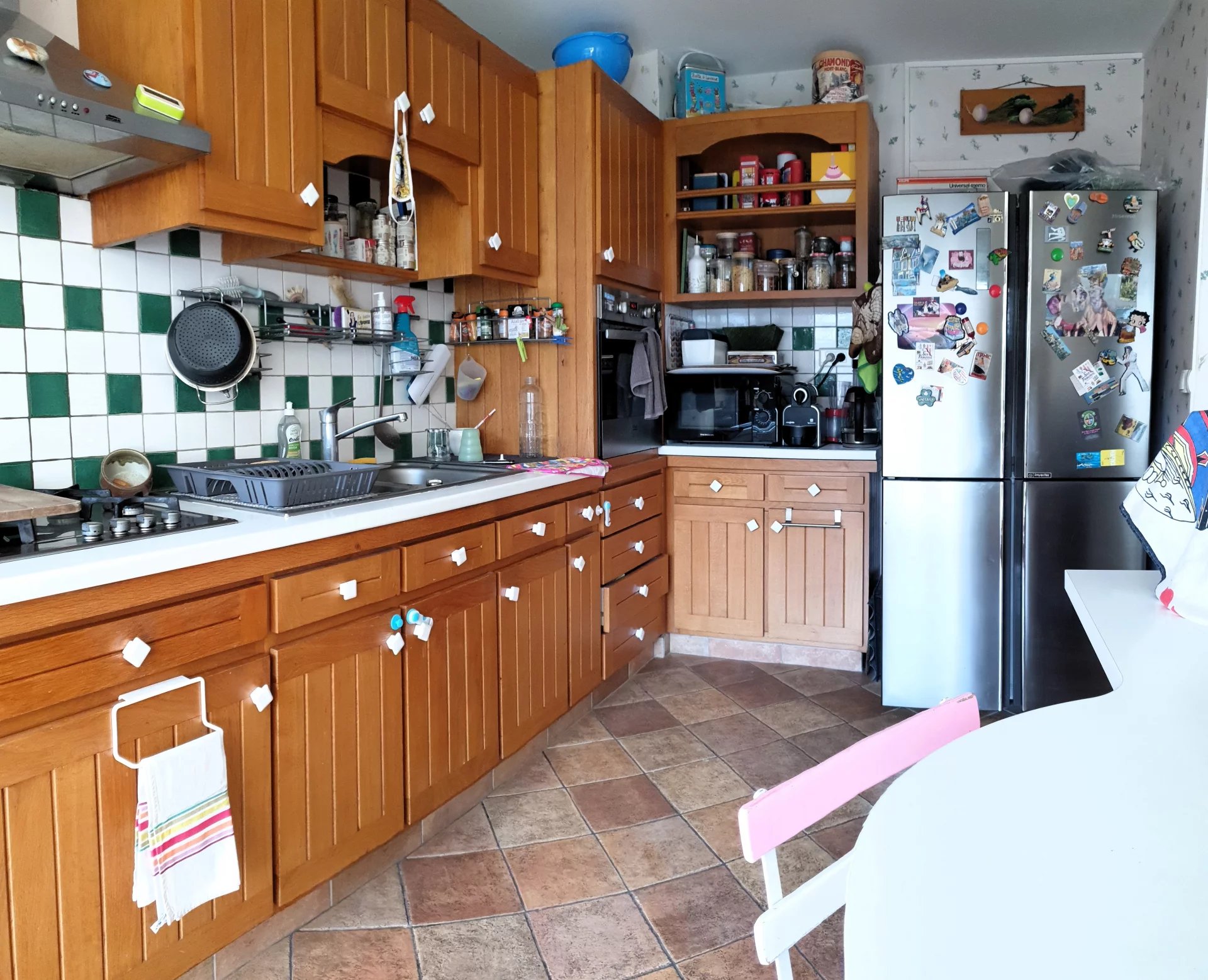 Maison en parfait état comprenant : entrée avec placard, grand séjour-salon de 46 m² donnant sur une cuisine ouverte aménagée équipée, WC séparé. Au 1er étage : trois chambres dont une avec un bureau en enfilade, salle de bain avec douche e ...