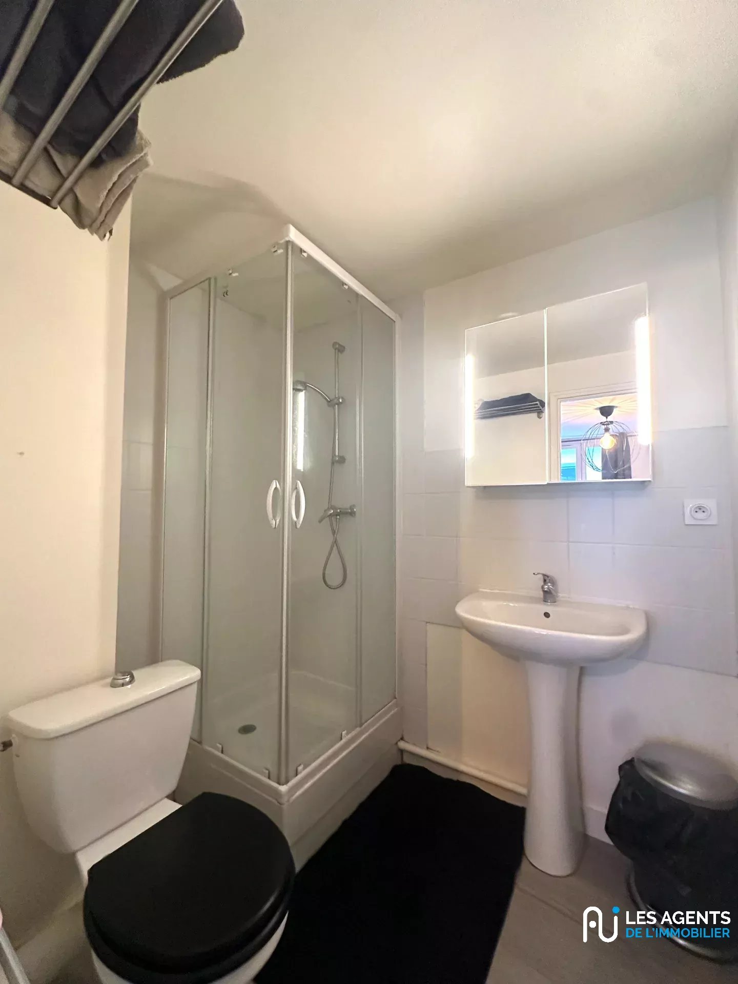 La chambre, baignée de lumière naturelle, donne sur une salle d'eau équipée et un WC, pour un confort optimal au quotidien.