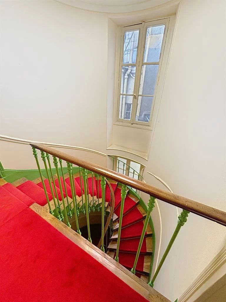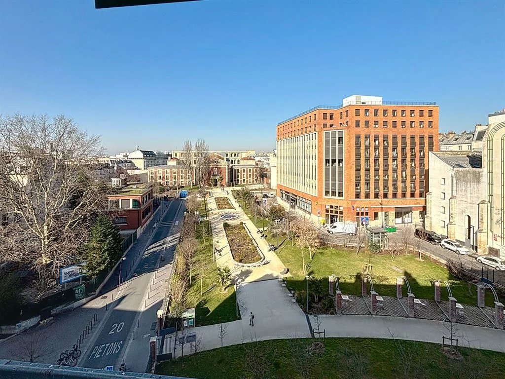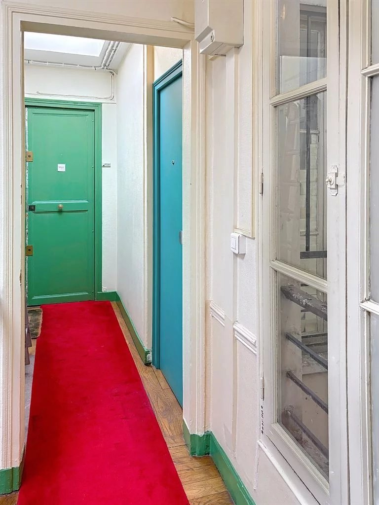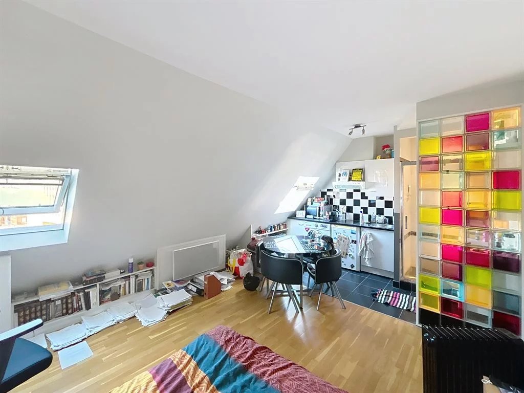 Au sixième étage d'un bel immeuble pierre de taille, ce studio offre une entrée avec fenêtre sur courette, une pièce mansardée côté rue et éclairée par deux velux, un coin cuisine et un coin salle d'eau, des wc séparés. Vue dégagée.