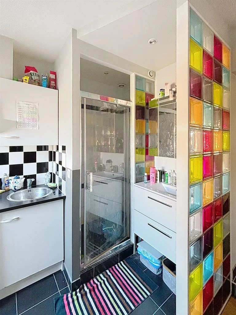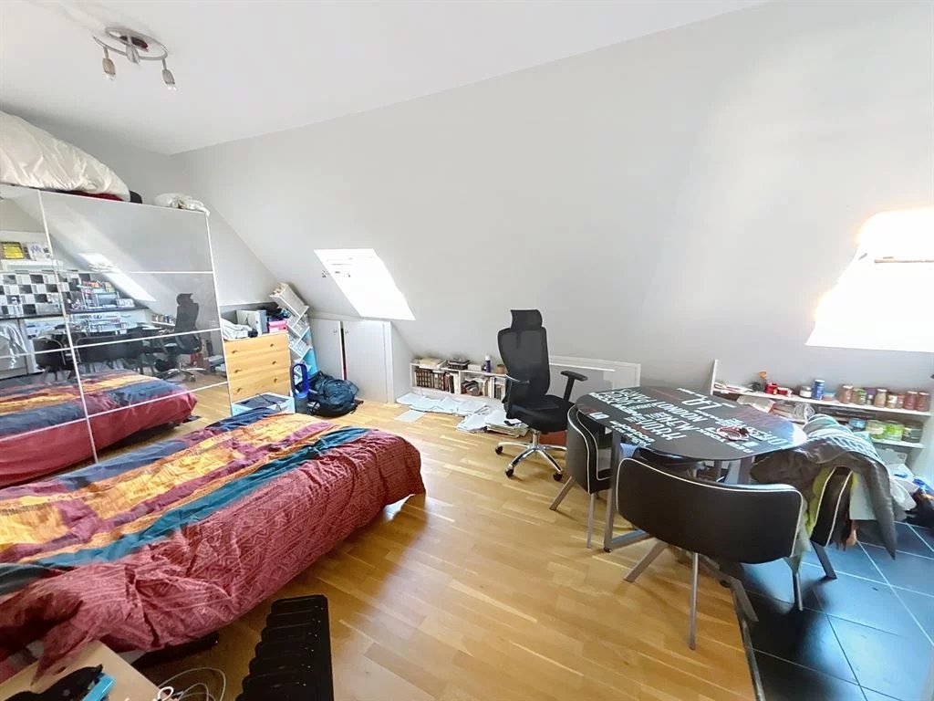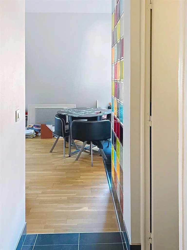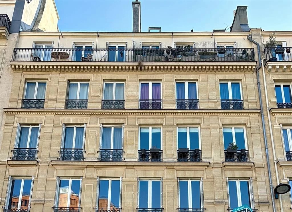Au sixième étage d'un bel immeuble pierre de taille, ce studio offre une entrée avec fenêtre sur courette, une pièce mansardée côté rue et éclairée par deux velux, un coin cuisine et un coin salle d'eau, des wc séparés. Vue dégagée.