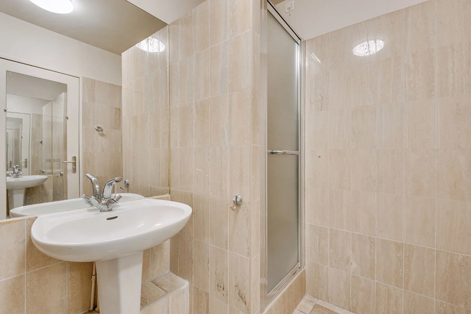 A 100 mètres de la place des Ternes, 64 av de Wagram, au 4e étage d'un immeuble 1980, vaste 3 pièces (87.8 m² carrez + balcons 2.m² et 2.80m²,) comprenant: séjour 18.45m² + 2 chambres (14,64 et 20,66 m²) cuisine, salle de bains + salle d'eau, nombreux rangements (placards et dressing). A moderniser . Double exposition. Cave. Possibilité parking en sus 45.000 euros