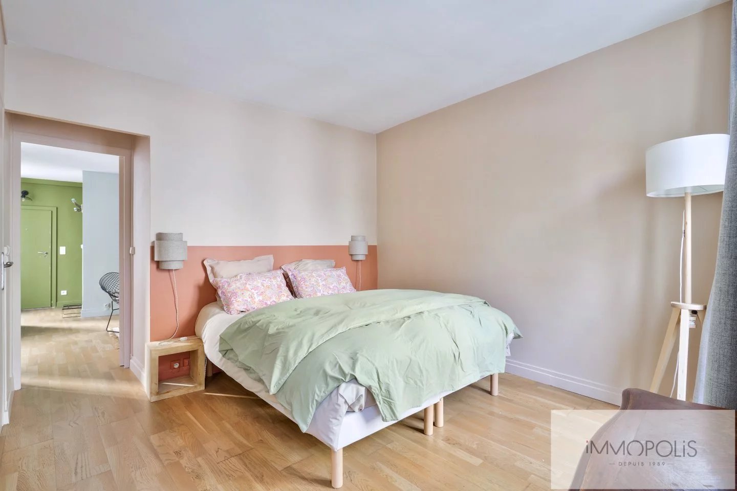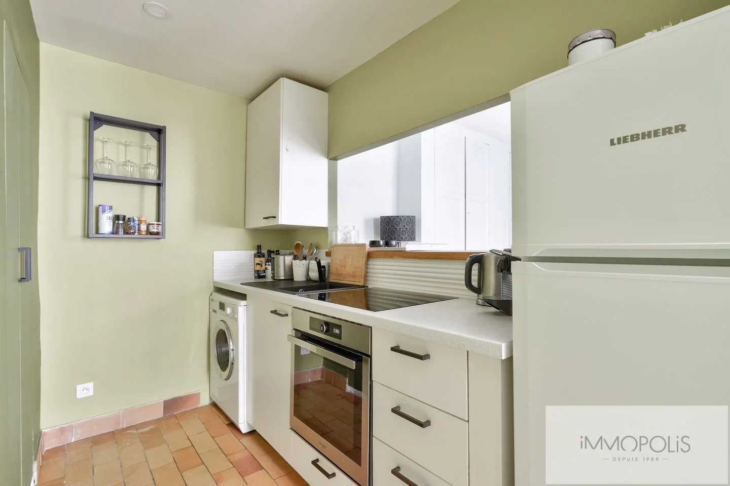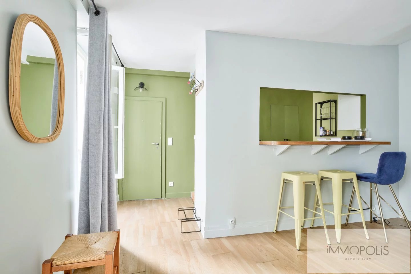 Rue des 3 Frères charmant appartement entièrement rénové par architecte d'une superficie de 30,35m² Carrez, traversant, donnant sur cour calme et lumineux, comprenant séjour sur rue, chambre sur cour, cuisine indépendante aménagée donnant s ...