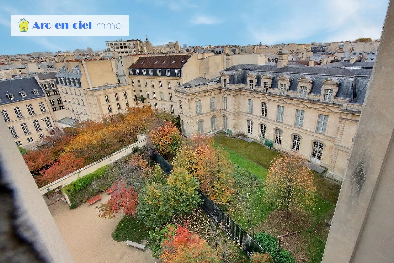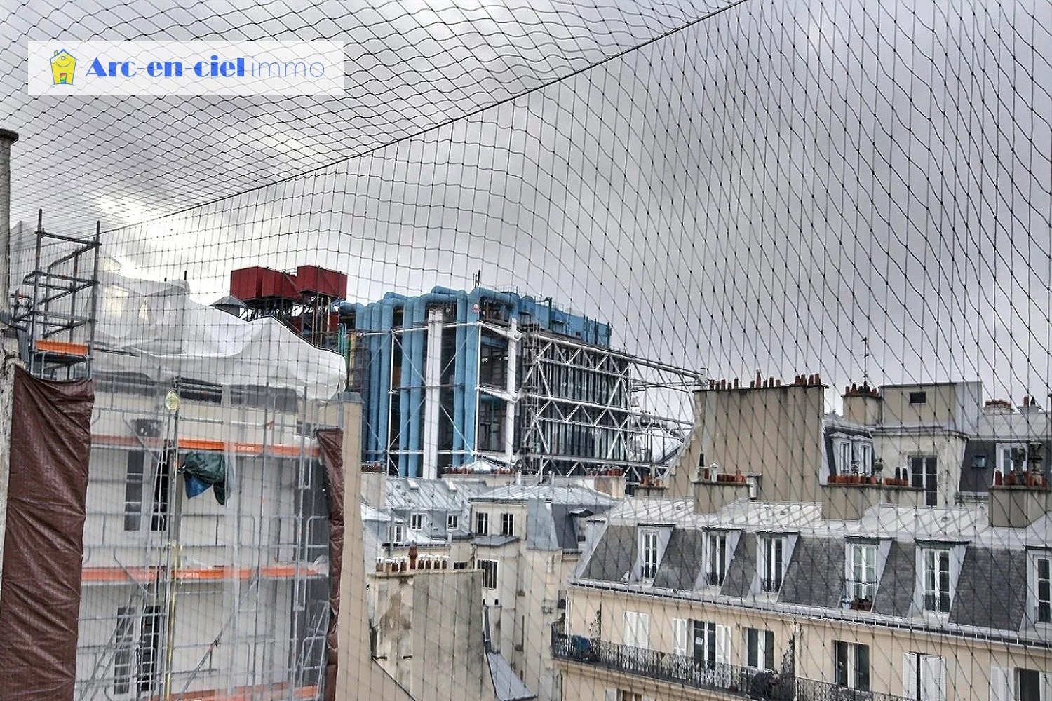 Cité Noël, accès rue Rambuteau au 7ème étage avec ascenseur, ce 2 pièces de 36,38m2 pondéré dont 35.21m2 Carrez + grenier privatif (environ 7m2 au sol dont 1,17m à plus de 1.80m de hauteur avec 'tabatière'), VUE SUR JARDIN ANNE FRANK, Hôtels Particuliers et vue panoramique sur Paris. Habitable en l'état ou à rénover, il comprend actuellement un séjour avec 2 fenêtres, une cuisine avec vue sur le Centre Culturel Pompidou, une grande chambre avec 2 fenêtres, une grande salle de bains avec bidet et un wc séparé. Plan modulable dont plusieurs solutions d'aménagement, mais il est facile d'agrandir le séjour avec vue sur jardins, réduire la chambre et la salle de bains. Et pourquoi pas demander à la copropriété l'autorisation de casser une partie du plafond du séjour qui est le plancher du grenier privatif pour faire un beau volume et un appartement de caractère... double vitrage, bons radiateurs radians, ballon d'eau chaude thermodynamique, mais il reste à isoler plafond et murs pour améliorer le DPE. Immeuble avec gardienne.