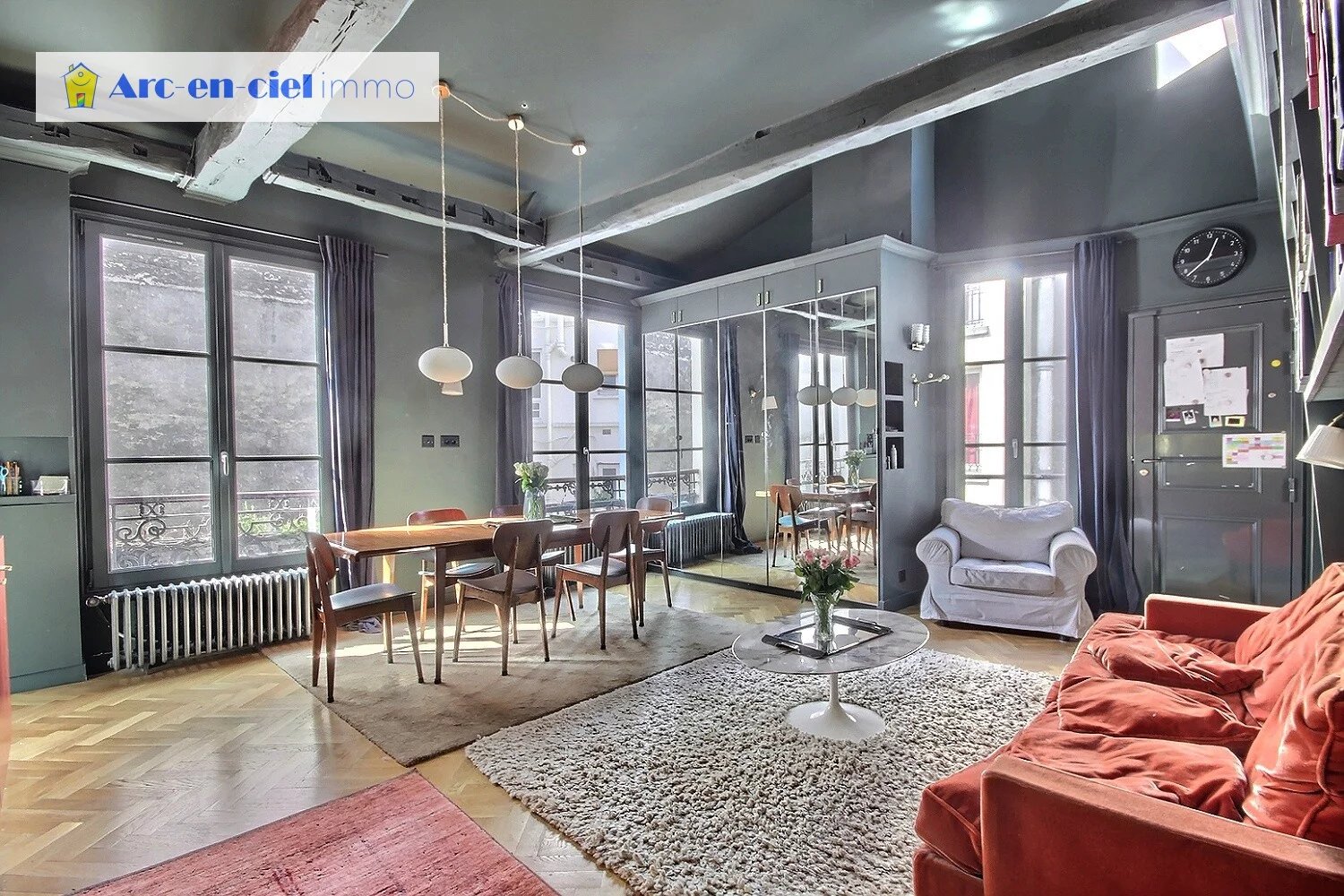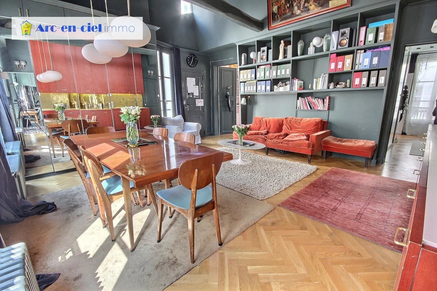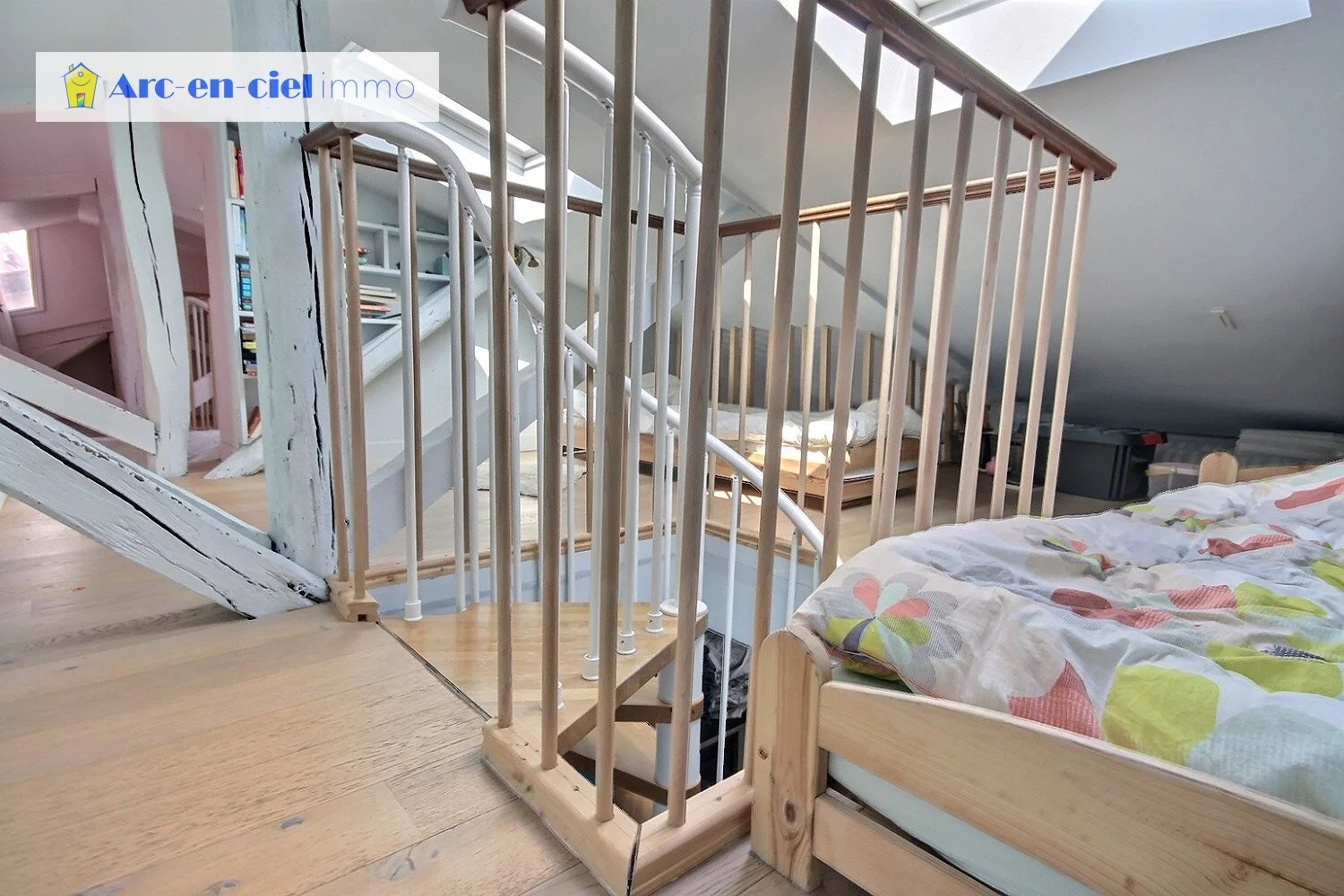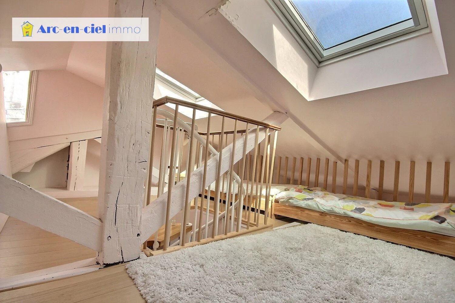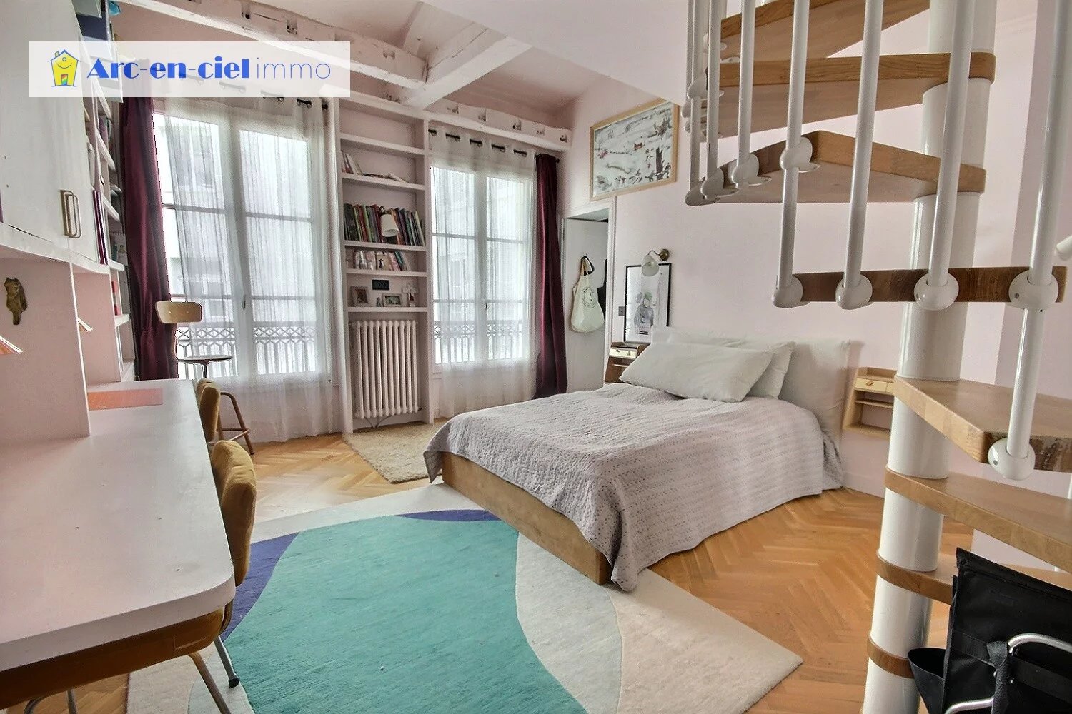 DUPLEX à proximité de la Place de la République, côté Paris 3ème HAUT MARAIS, au 3ème et dernier étage SANS ascenseur, seul sur le palier, sur 2 cours paysagées au calme. il comprend : séjour avec cuisine US de 31m2 avec très grande hauteur sous plafond et possibilité de mettre mezzanine et des velux pour augmenter la lumière (demande faite à la copropriété en cours), Salon ou chambre 1 de 20m2, avec une mezzanine de couchage de 14m2 au sol (moins de 1,80m de hauteur sous plafond dans les combles), Chambre 2 de 18m2 avec sa salle de bains WC et avec une mezzanine de couchage de 21.5m2 au sol (moins de 1,80m de hauteur sous plafond dans les combles), les 2 mezzanines se rejoignent et ont chacune leurs escaliers descendant à la pièce dessous. 3ème chambre parentale de 19m2 avec belle hauteur sous plafond, avec sa salle d'eau et 2ème WC. Plan 'comme un carré divisé en 4', pas de couloir dit 'A la Française'. Surface au sol 132.11m2 dont 93.12m2 Carrez (la différence les 39m2 non Carrez sont les 2 mezzanines et sous escaliers que nous avons pondérés à 1/3, soit 106m2 pondérés habitables). ATYPIQUE mais RATIONNEL, nombreux rangements. Double exposition SUD et Nord, fenêtres en double vitrage et oscillo-battantes, chauffage individuel au gaz.