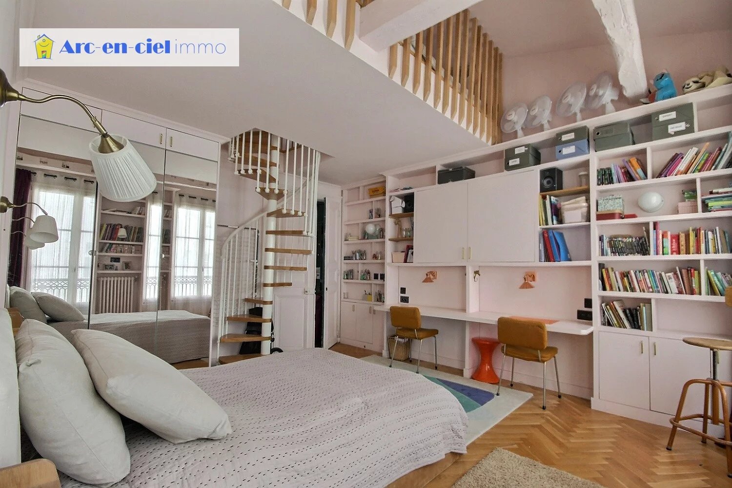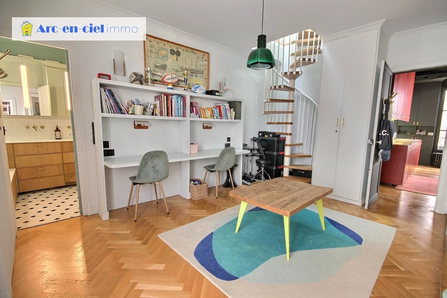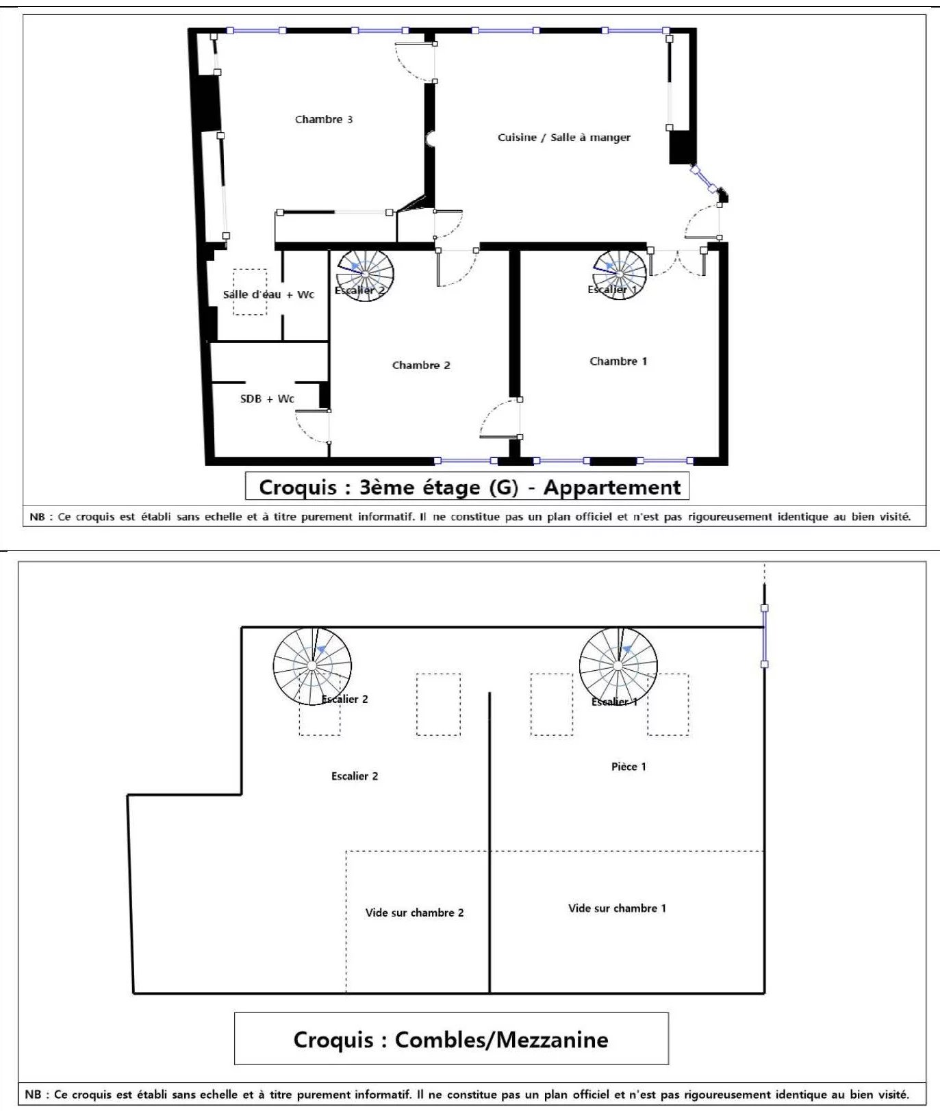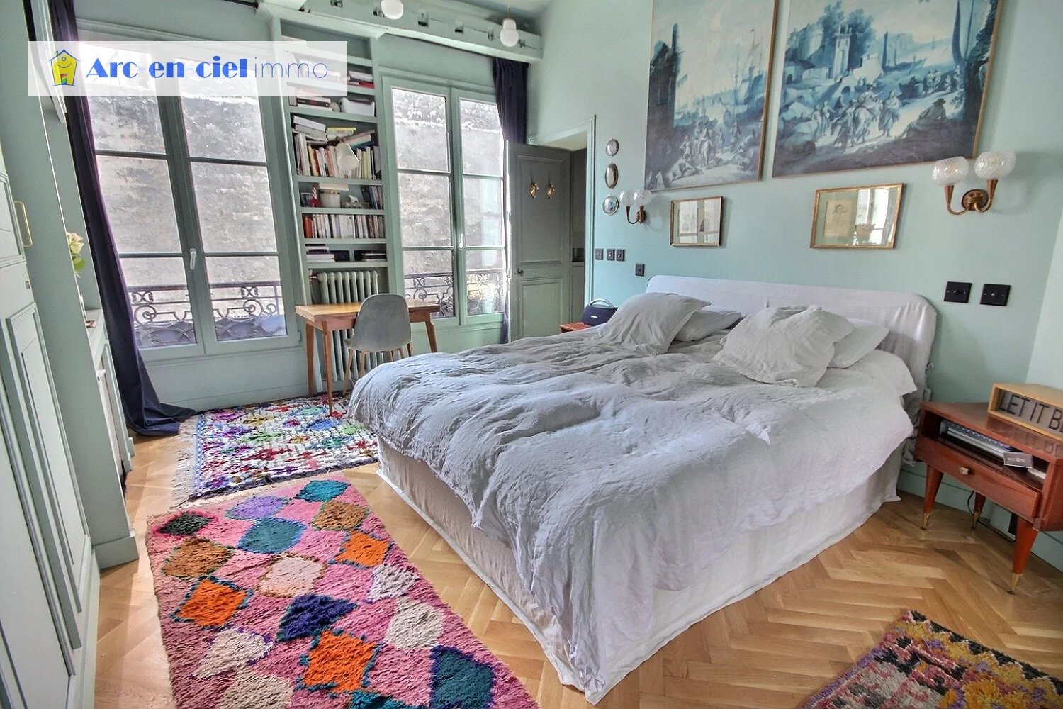 DUPLEX à proximité de la Place de la République, côté Paris 3ème HAUT MARAIS, au 3ème et dernier étage SANS ascenseur, seul sur le palier, sur 2 cours paysagées au calme. il comprend : séjour avec cuisine US de 31m2 avec très grande hauteur sous plafond et possibilité de mettre mezzanine et des velux pour augmenter la lumière (demande faite à la copropriété en cours), Salon ou chambre 1 de 20m2, avec une mezzanine de couchage de 14m2 au sol (moins de 1,80m de hauteur sous plafond dans les combles), Chambre 2 de 18m2 avec sa salle de bains WC et avec une mezzanine de couchage de 21.5m2 au sol (moins de 1,80m de hauteur sous plafond dans les combles), les 2 mezzanines se rejoignent et ont chacune leurs escaliers descendant à la pièce dessous. 3ème chambre parentale de 19m2 avec belle hauteur sous plafond, avec sa salle d'eau et 2ème WC. Plan 'comme un carré divisé en 4', pas de couloir dit 'A la Française'. Surface au sol 132.11m2 dont 93.12m2 Carrez (la différence les 39m2 non Carrez sont les 2 mezzanines et sous escaliers que nous avons pondérés à 1/3, soit 106m2 pondérés habitables). ATYPIQUE mais RATIONNEL, nombreux rangements. Double exposition SUD et Nord, fenêtres en double vitrage et oscillo-battantes, chauffage individuel au gaz.