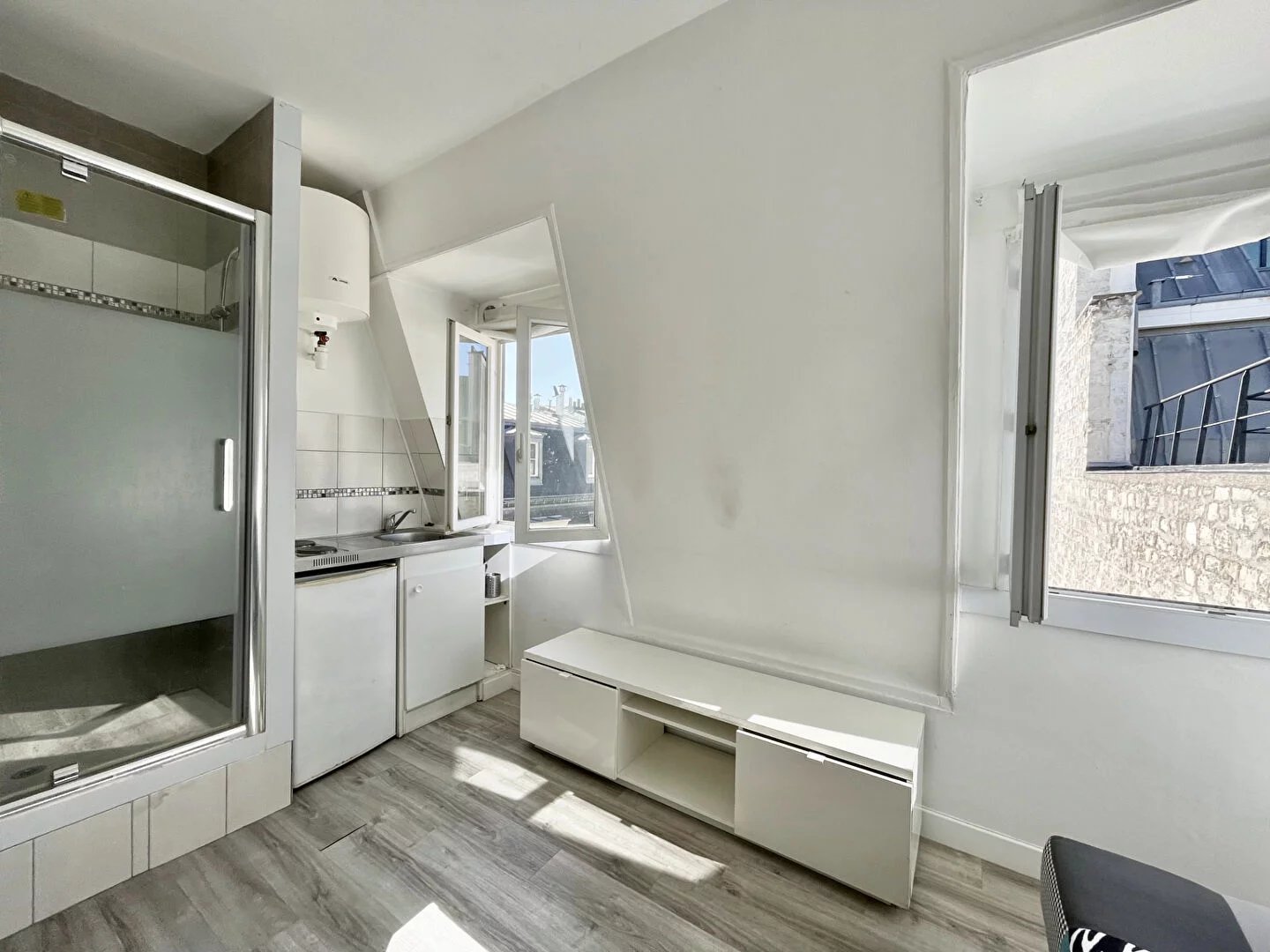 Les Loges Immobilier vous proposent à la vente ce charmant studio de 12m2 (11.50 m2 carrez) situé dans un bel immeuble haussmannien, bien tenu et sécurisé. Entre la Place de Narvik et le Bd Haussmann. Situé au 6e et dernier étage par escalier de service cette studette comporte une pièce de vie avec 2 fenêtre (double vitrage), d'un coin cuisine, d'une douche et de rangements. WC sur le palier, avec opportunité d'achat de la partie commune permettant d'agrandir le bien. Vue complètement dégagée sur les toits, Bon état général Idéal investissement locatif (rentabilité autour de 5%) Informations et rdv Jade Pinguelo : 06.61.73.35.59 (7.41 % honoraires TTC à la charge de l'acquéreur.) Copropriété de 45 lots - dont 25 lots habitation. (Pas de procédure en cours) \n\r Charges annuelles : 571.32 euros.