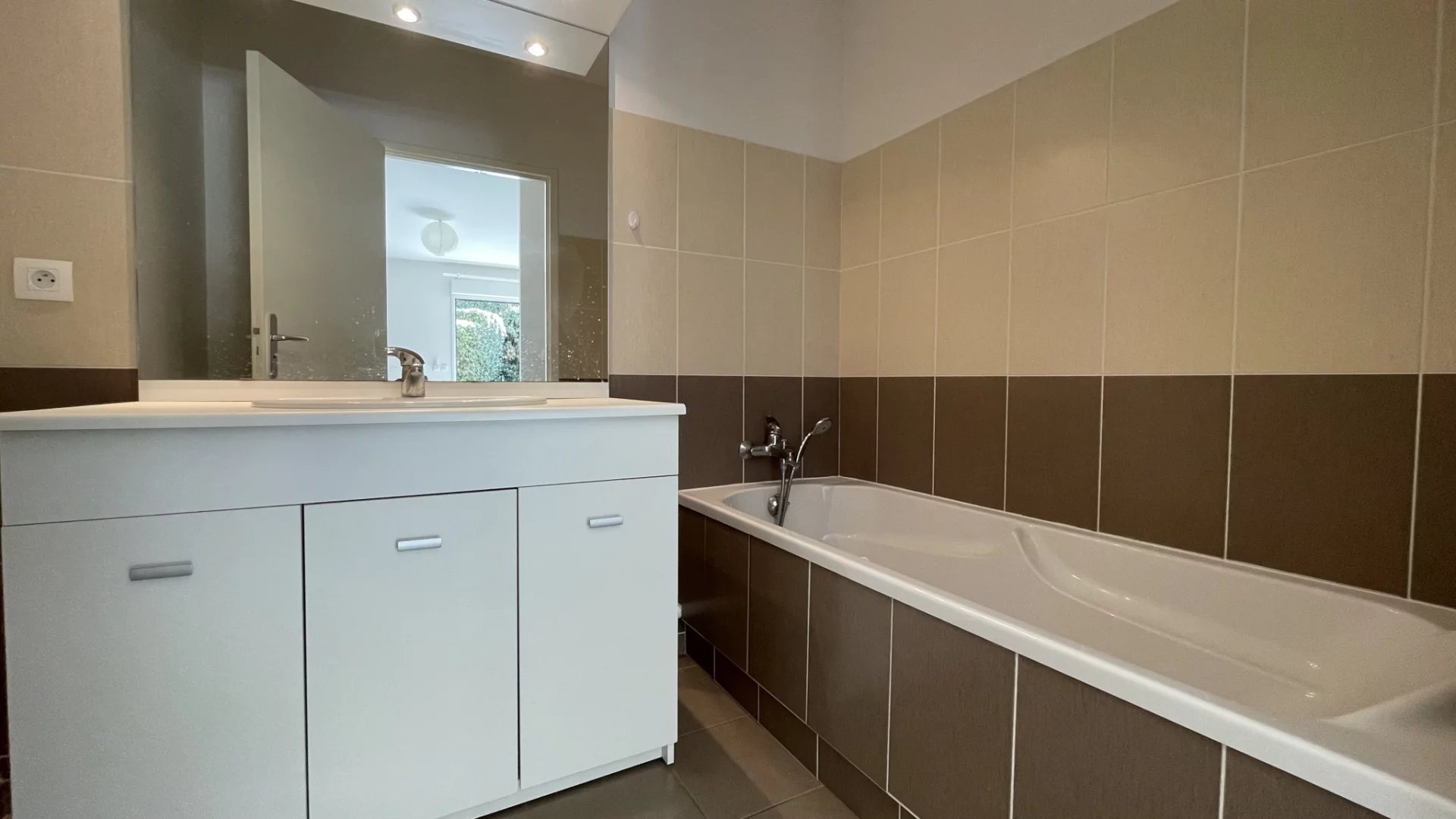 Une entrée avec placard, WC, salle de bains, 2 chambres avec placard, un séjour ouvrant sur une terrasse et un jardinet de 47 m2 exposés Sud/Ouest, une cuisine équipée ouvrant également sur terrasse et jardinet. Chauffage éléctrique.