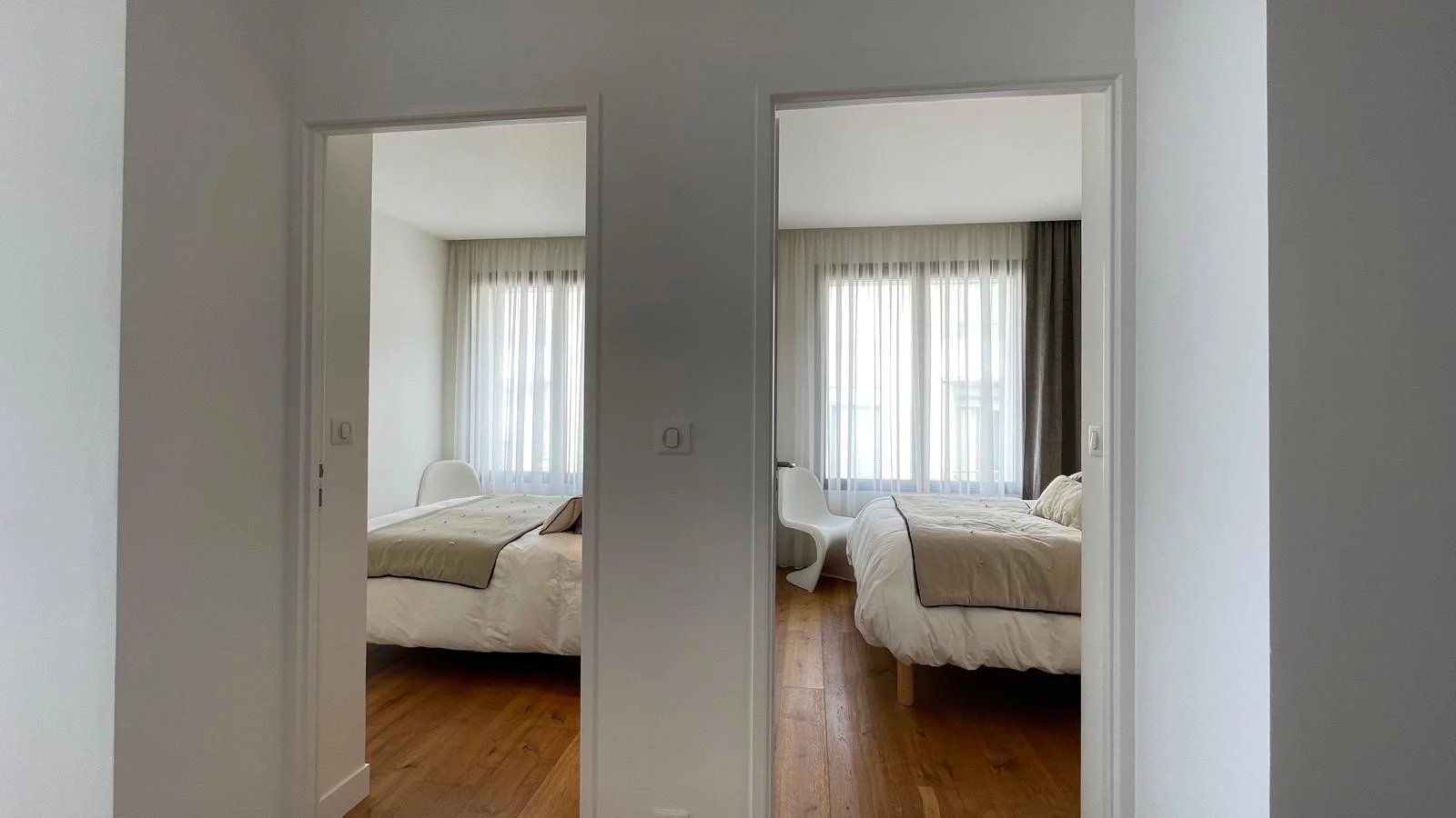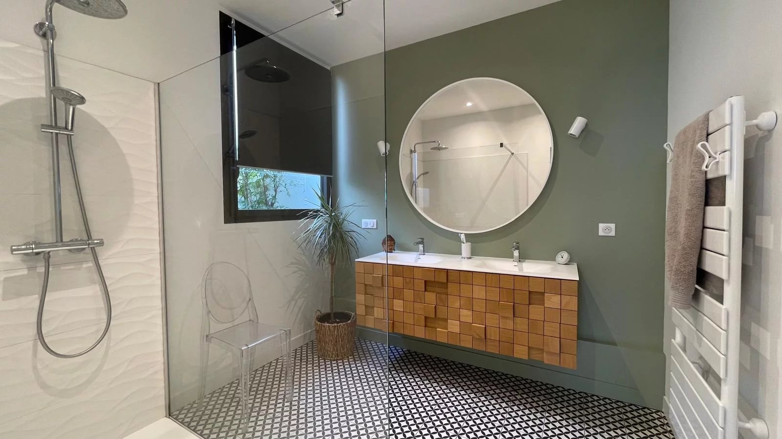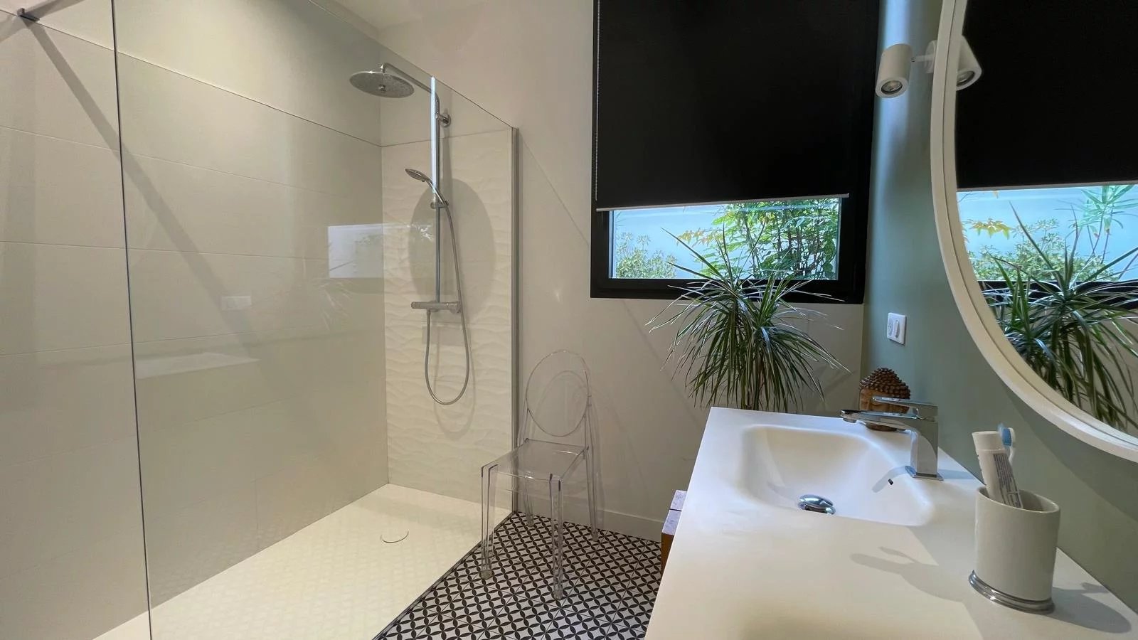 Entrée donnant sur patio, WC (suspendus avec fenêtre), dégagement, deux chambres avec placard dont une avec VUE SUR MER, salle d'eau avec placard (double vasque et douche à l'italienne), lingerie avec dressing, séjour FACE MER avec cuisine à l'américaine équipée (plaque induction, four, réfrigérateur/congélateur, lave-vaisselle).