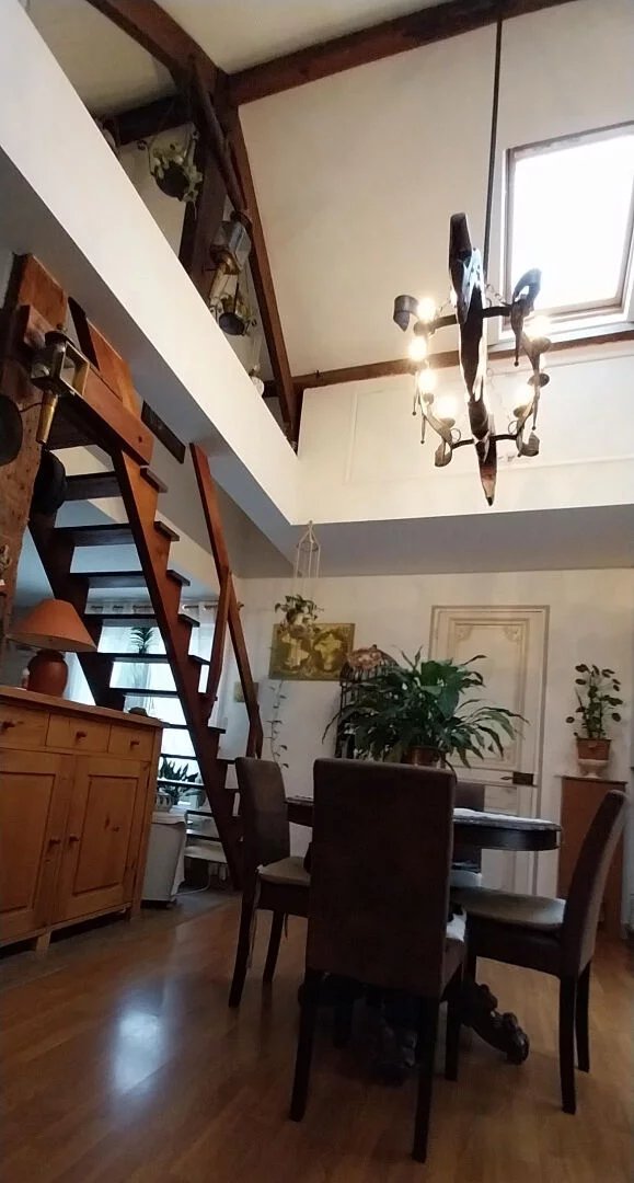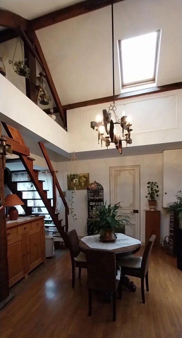 Celle-ci est composée d'une cuisine, un grand séjour cathédrale avec cheminée, une salle de douche avec WC.