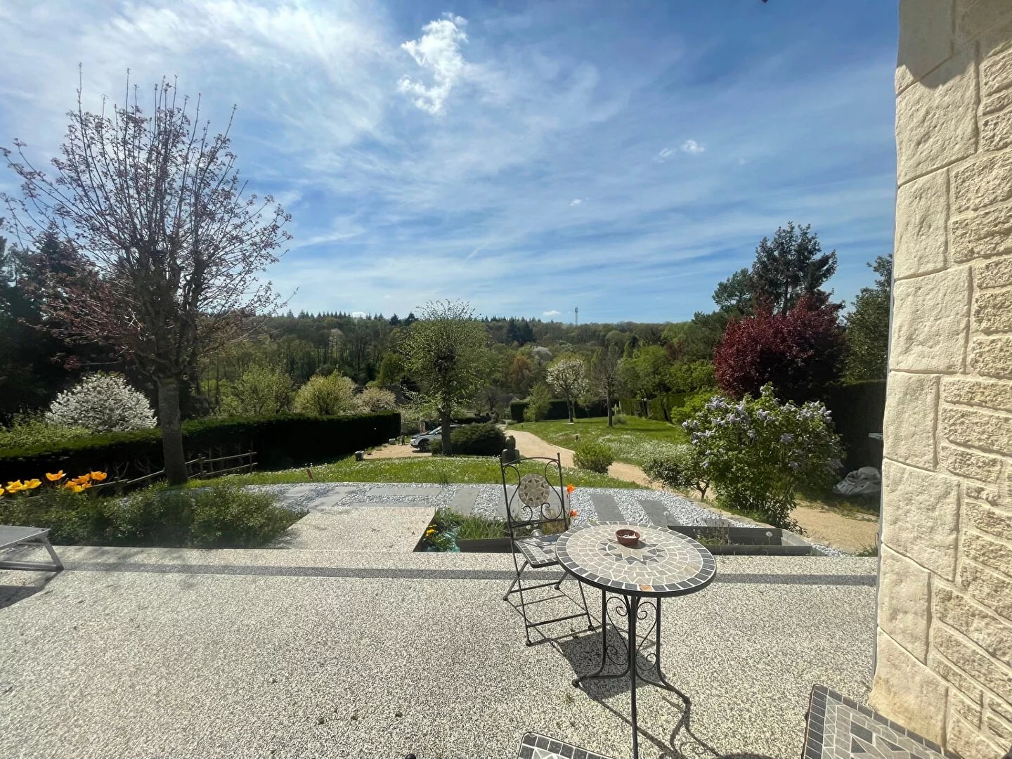 À l'extérieur, deux terrasses tranquilles vous attendent : l'une offrant une vue sur la vallée, l'autre donnant accès à la piscine chauffée, à l'abri des regards. De plus, la propriété dispose de deux écuries et d'une sellerie, parfaites pour les amateurs d'équitation.