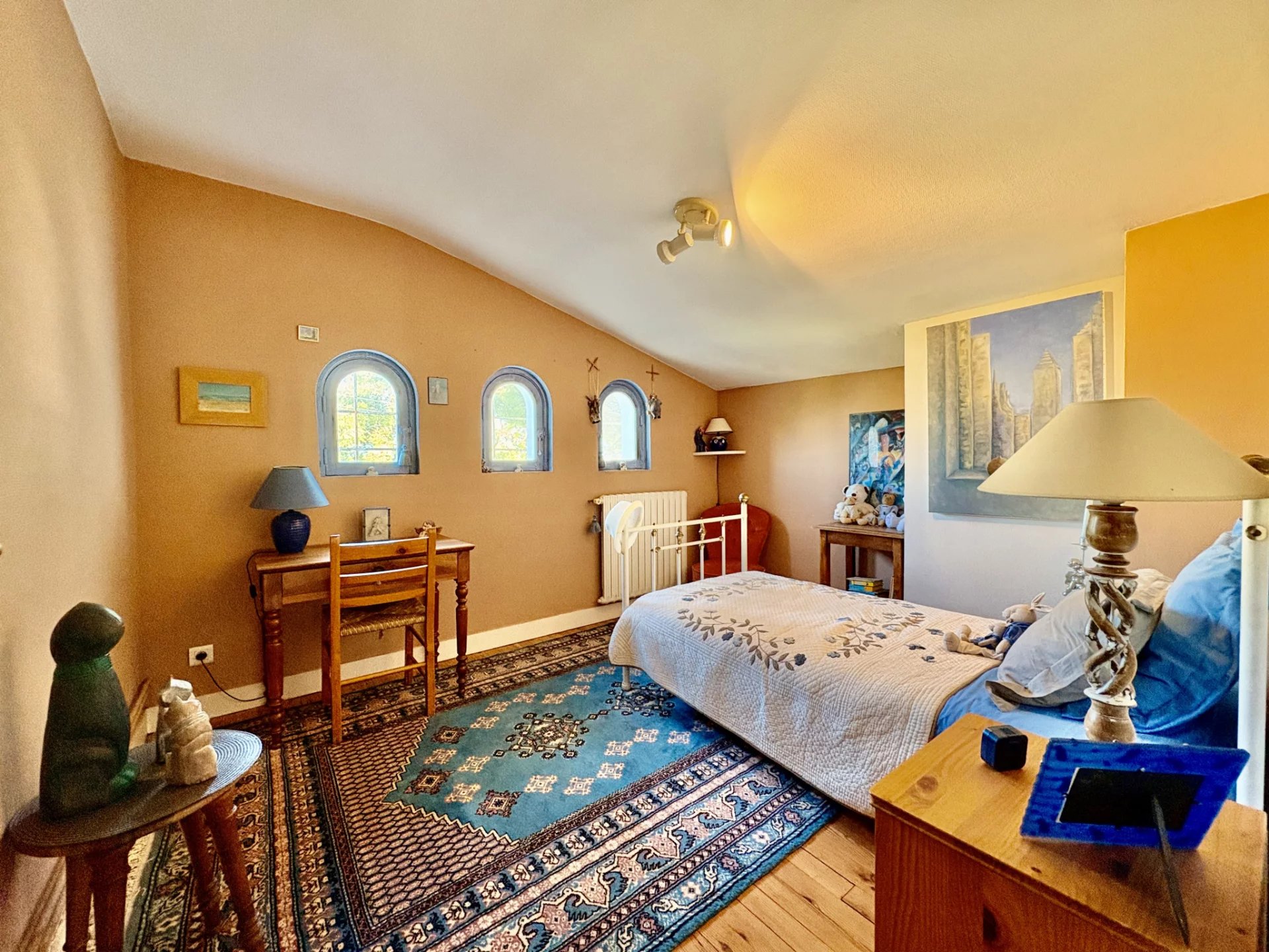 À l'étage, l'espace nuit se compose de quatre chambres, dont une avec balcon et parquet au sol, ainsi qu'un grand dressing indépendant. Une spacieuse salle d'eau, entièrement carrelée, avec baignoire d'angle et WC, complète ce niveau avec élégance.