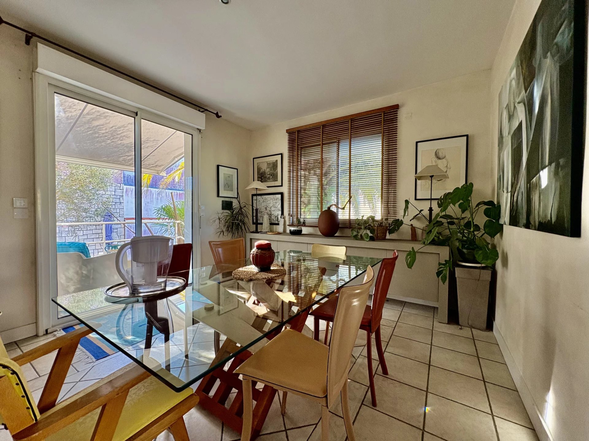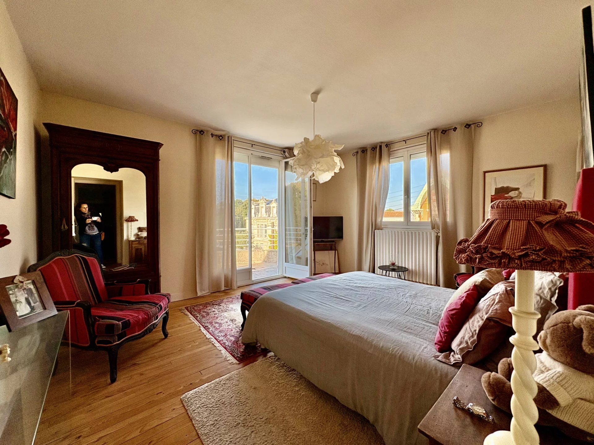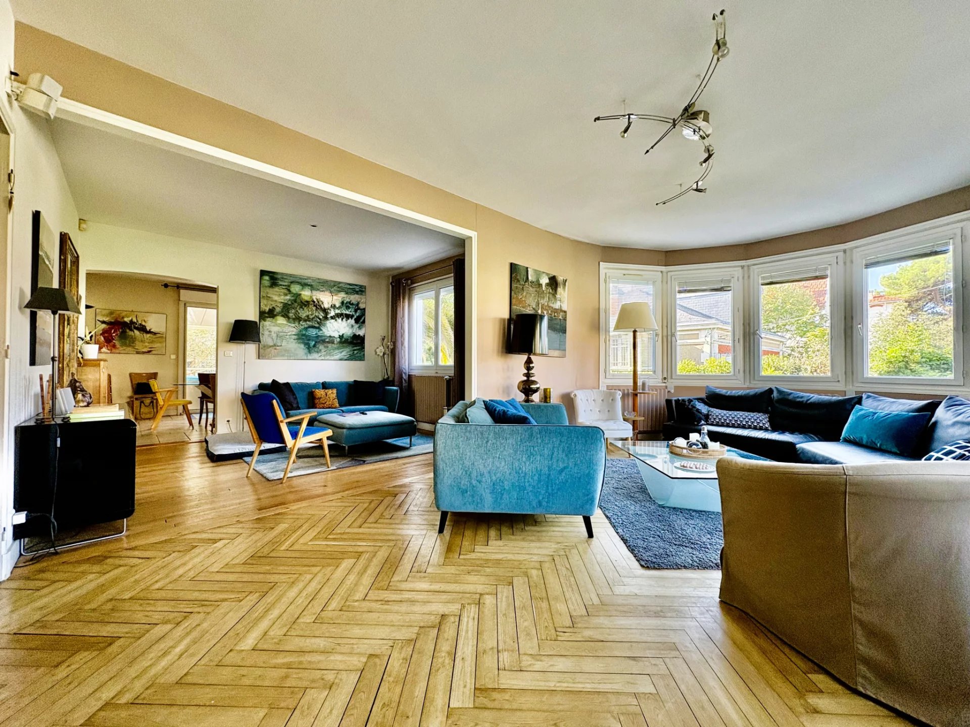 Dès l'entrée, la pièce de vie principale séduit par son bow-window baigné de lumière, son parquet en bâtons rompus et ses hauteurs sous plafond, qui créent une atmosphère chaleureuse et raffinée. Dans son prolongement, une vaste salle à manger s'ouvre sur la terrasse et l'espace extérieur, véritable appel aux beaux jours, avec cuisine d'été et belle piscine à l'abri des regards.