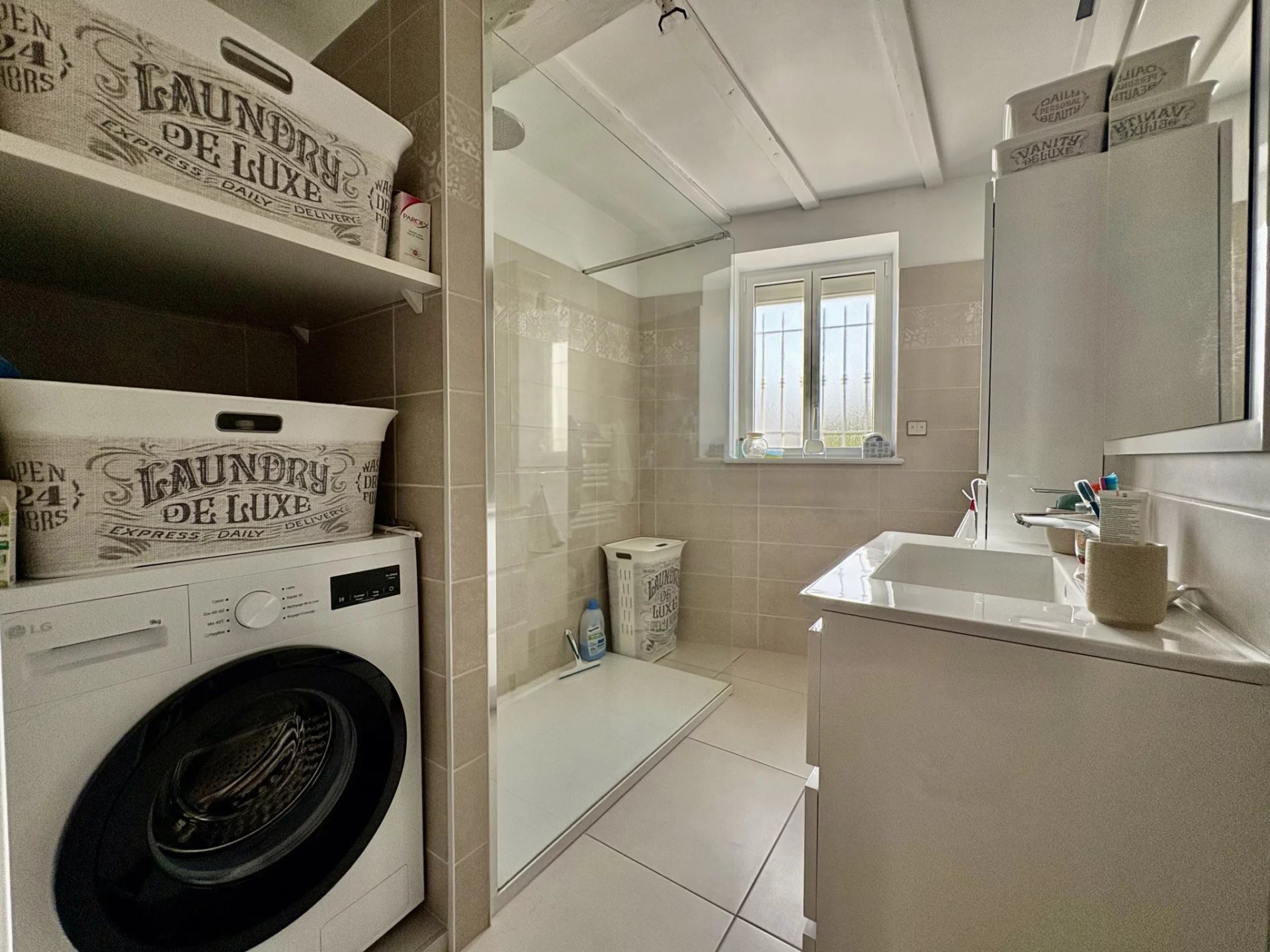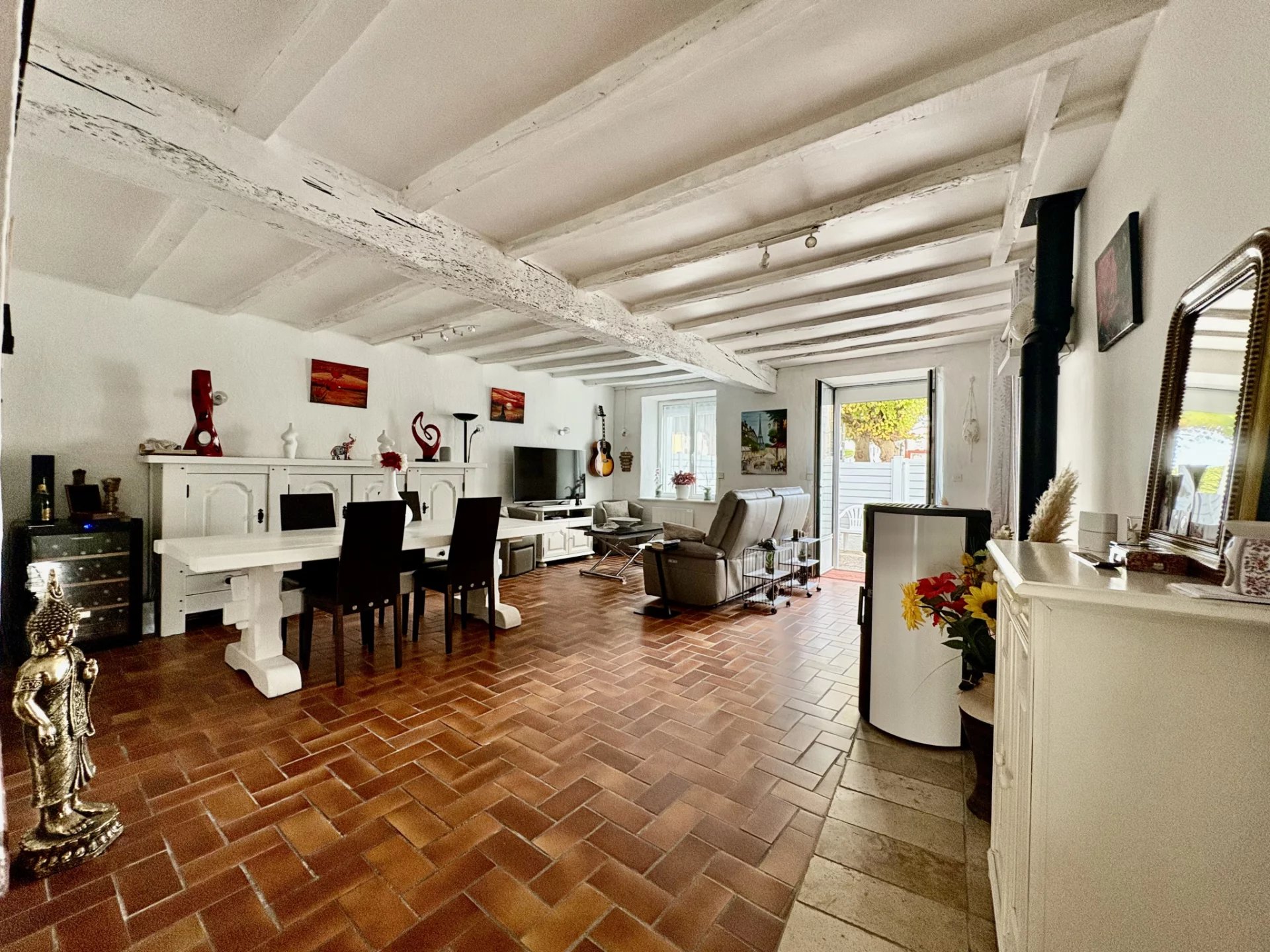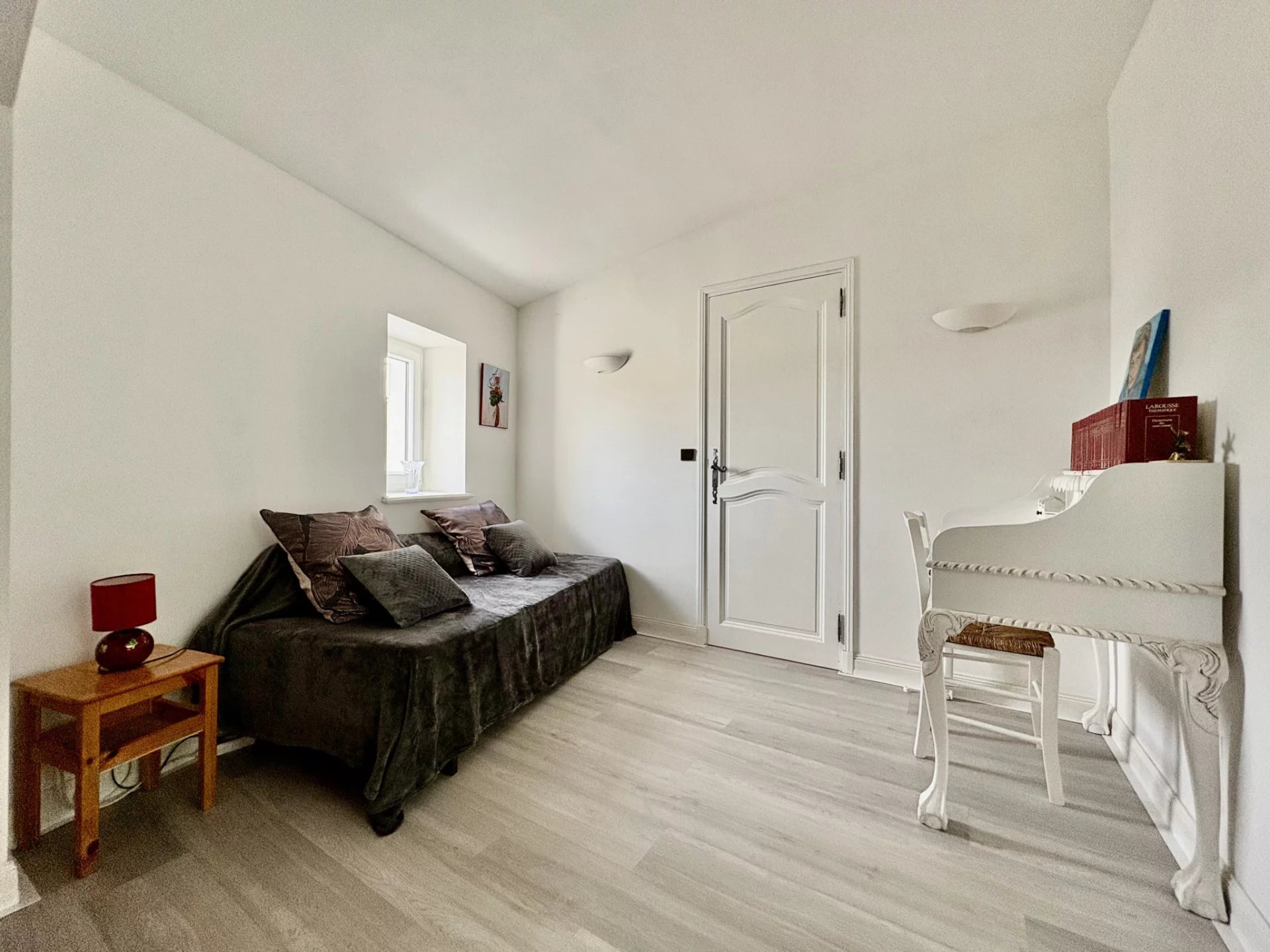 La maison dispose également d'une chambre spacieuse de 16 m2 avec placard, d'un espace bureau, d'une salle d'eau avec coin buanderie, et d'un WC indépendant. La cuisine, séparée, est entièrement équipée (four, hotte, plaque 3 feux, réfrigérateur).