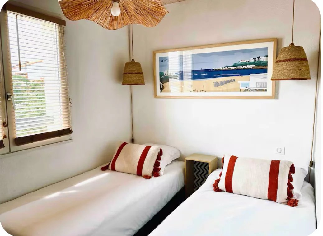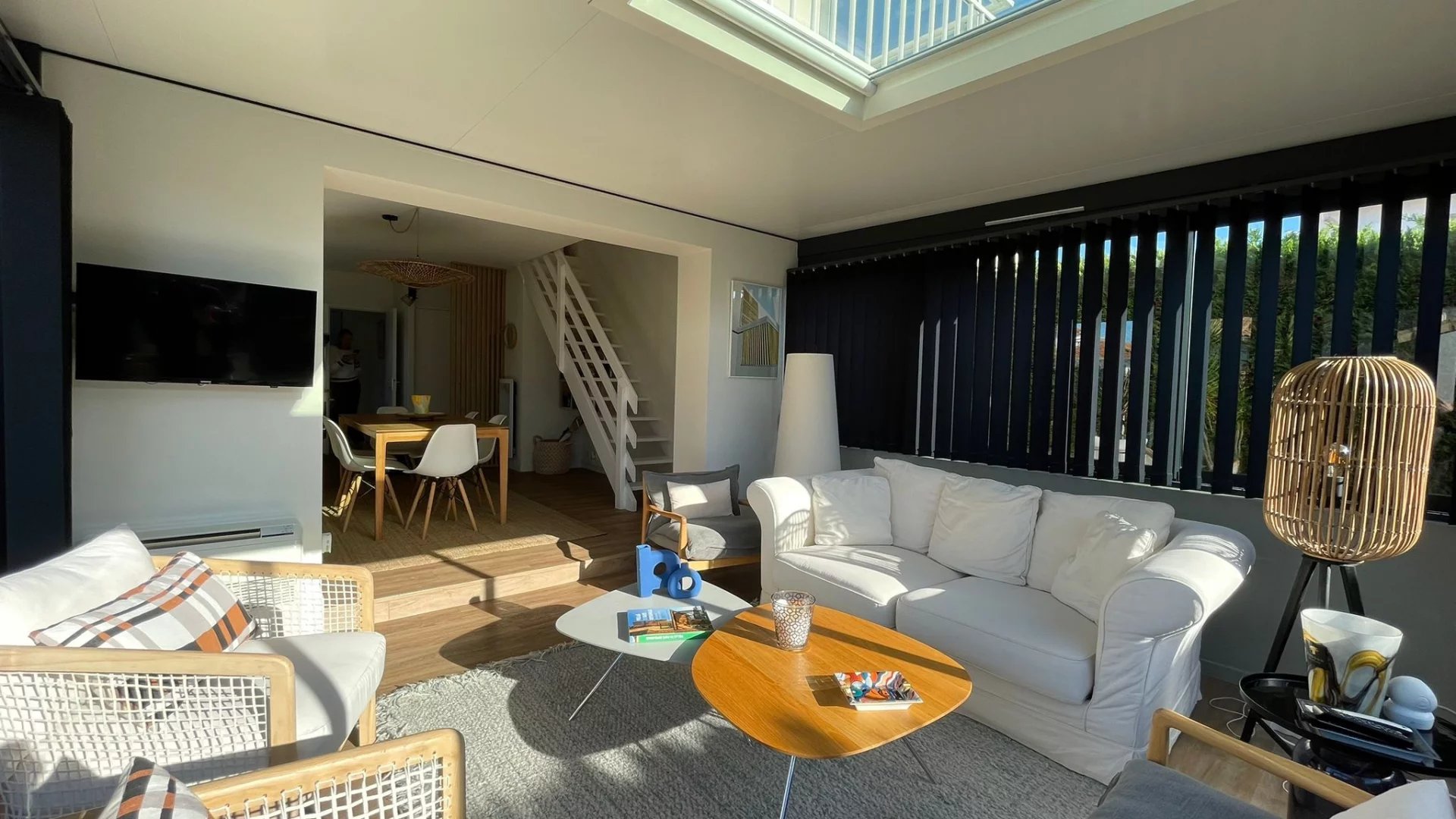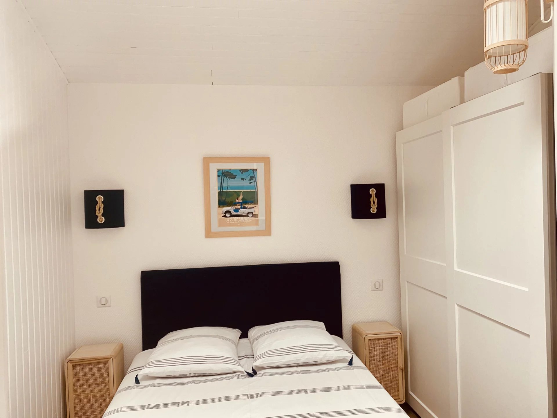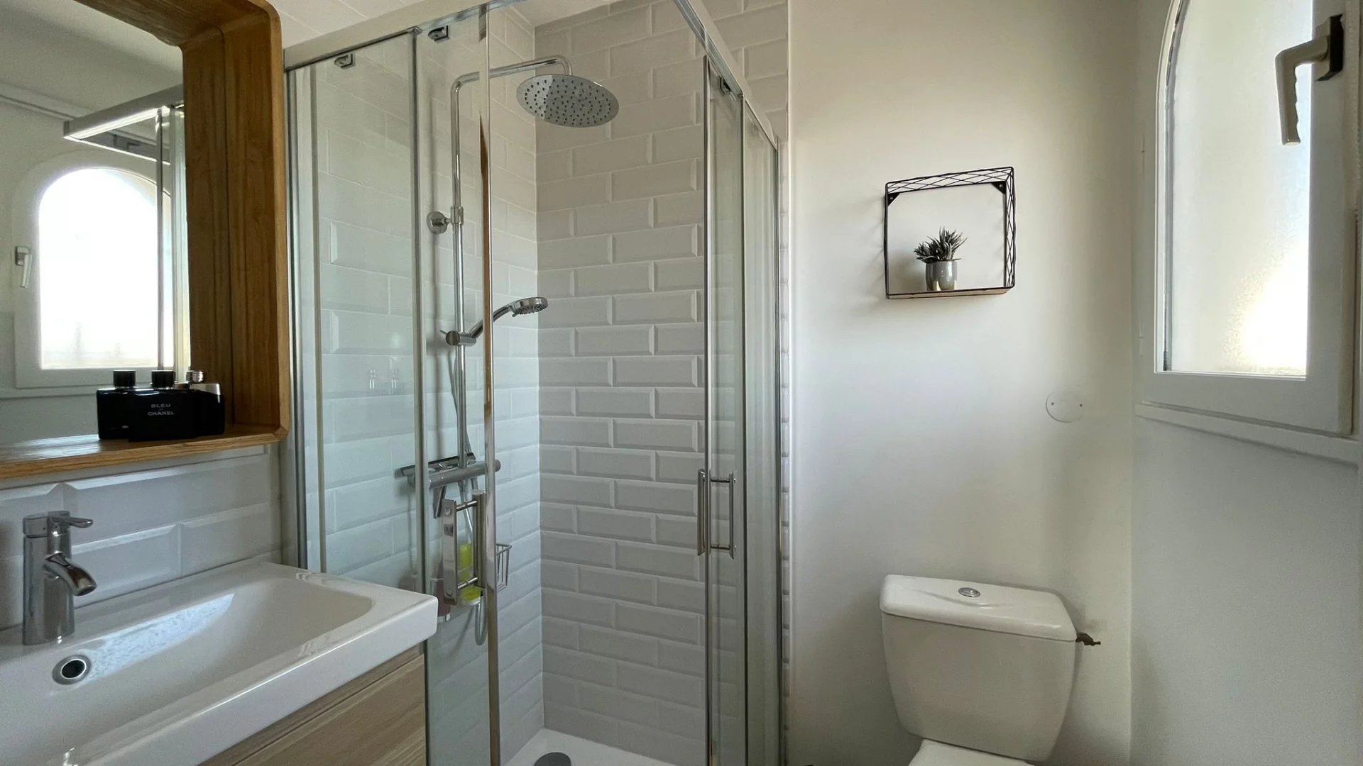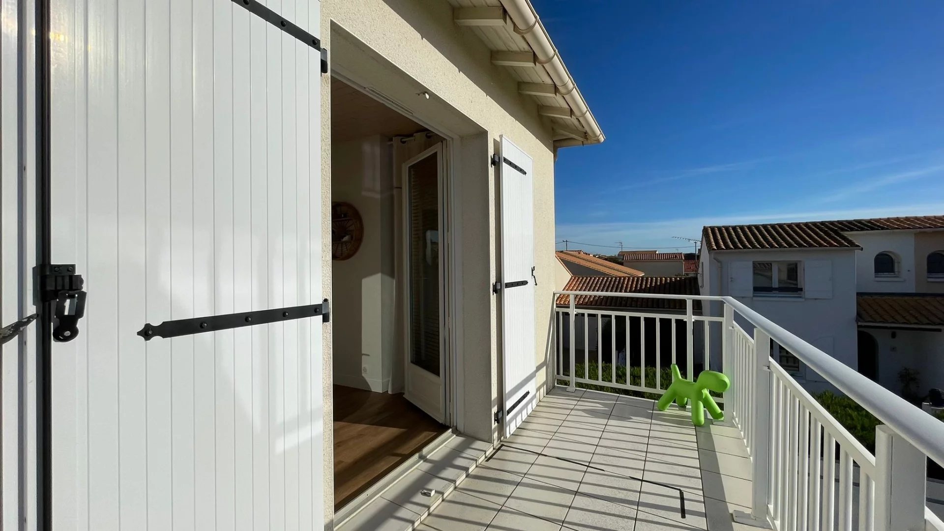 A l'étage : deux chambres, balcon avec VUE SUR MER, salle d'eau avec WC. Chauffage : pompe à chaleur réversible et convecteurs électriques.