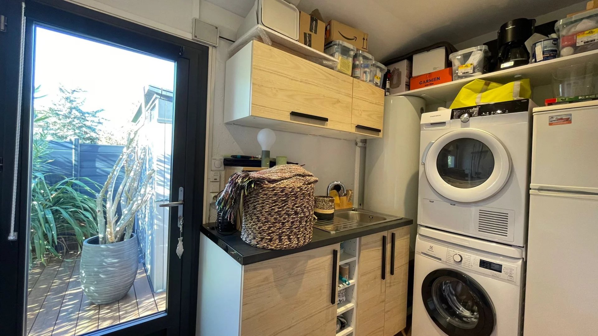 Au rez-de-chaussée : cuisine, séjour ouvrant sur jardin privatif, une chambre, salle d'eau, WC, cellier.