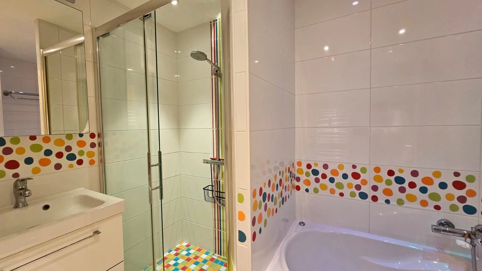 Dégagement avec placard, chambre, WC avec lave-mains, chambre ou bureau ouvrant sur jardin, salle de bains (avec douche et baignoire), chambre.