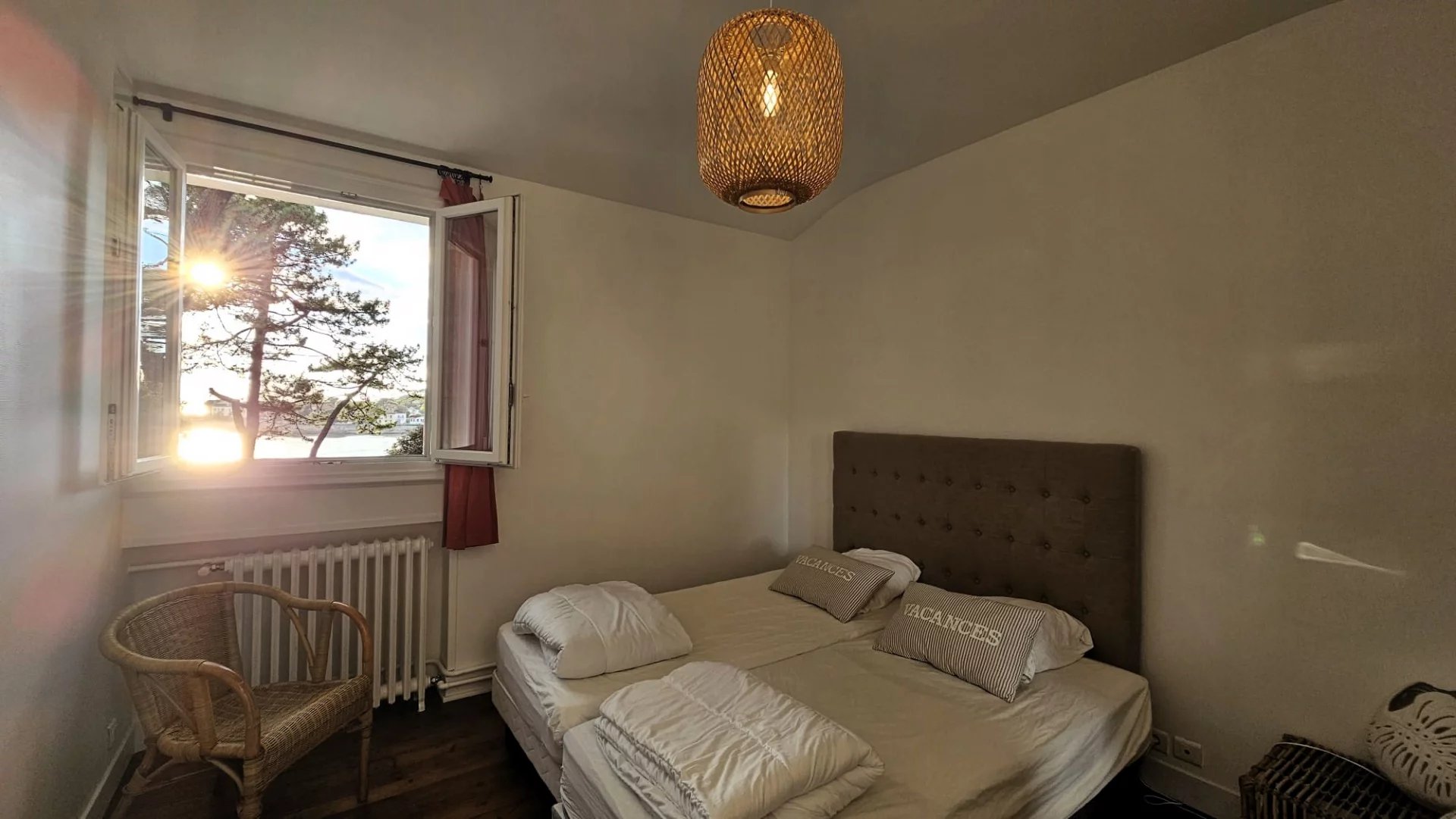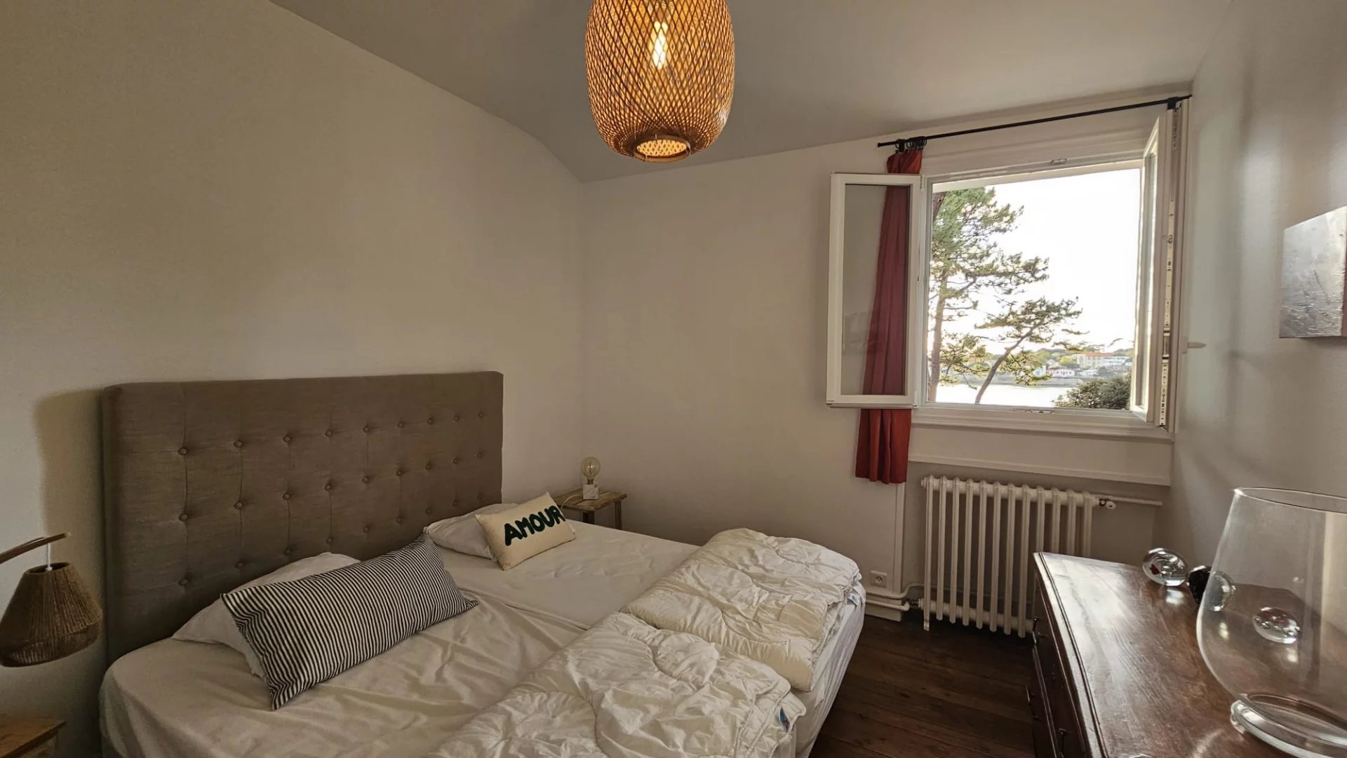 La maison d'amis développe environ 68m2 de plain-pied et comprend une cuisine aménagée, une pièce de vie en L, deux chambres et une salle d'eau avec WC. Le chauffage et la production d'eau chaudes sont électriques.